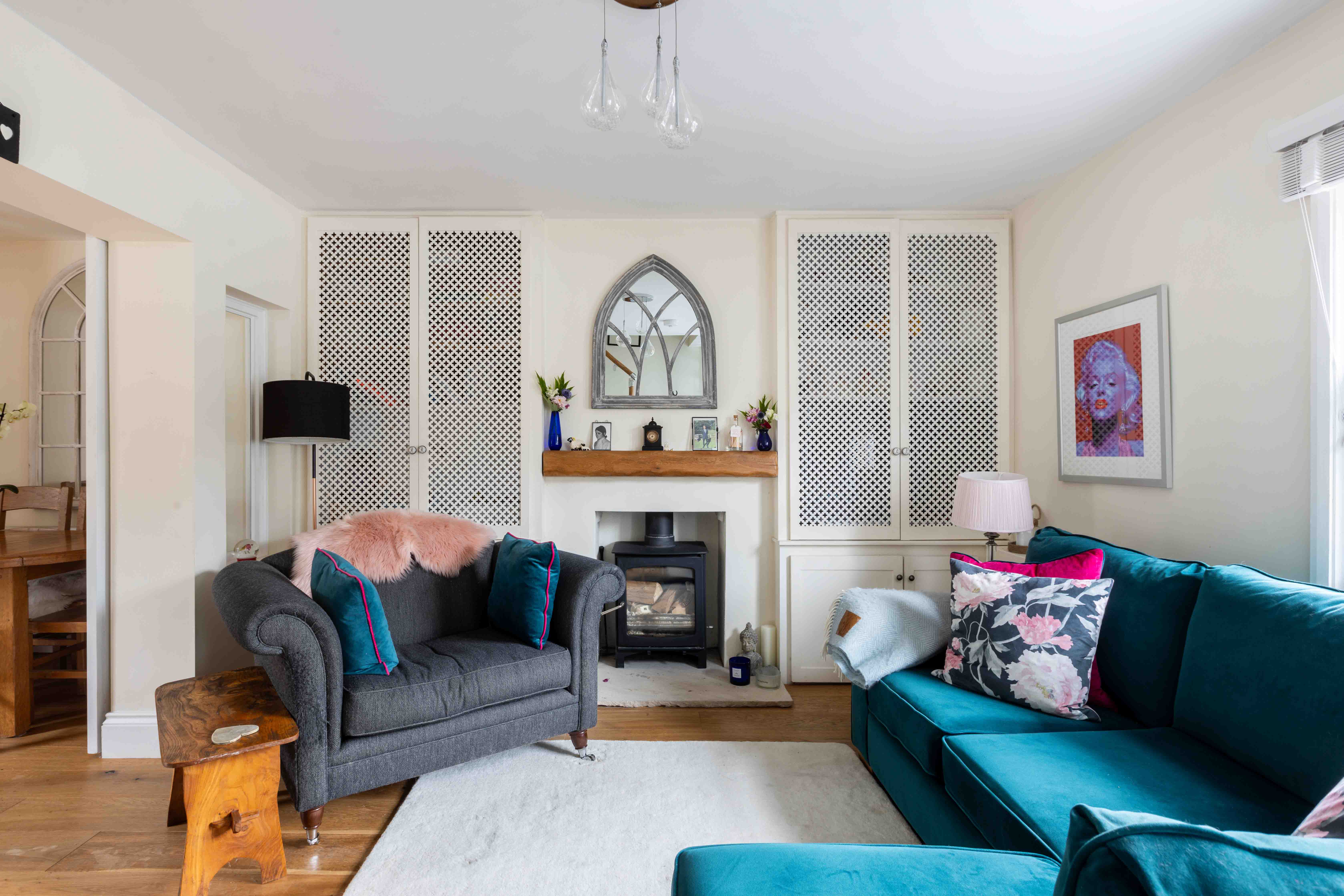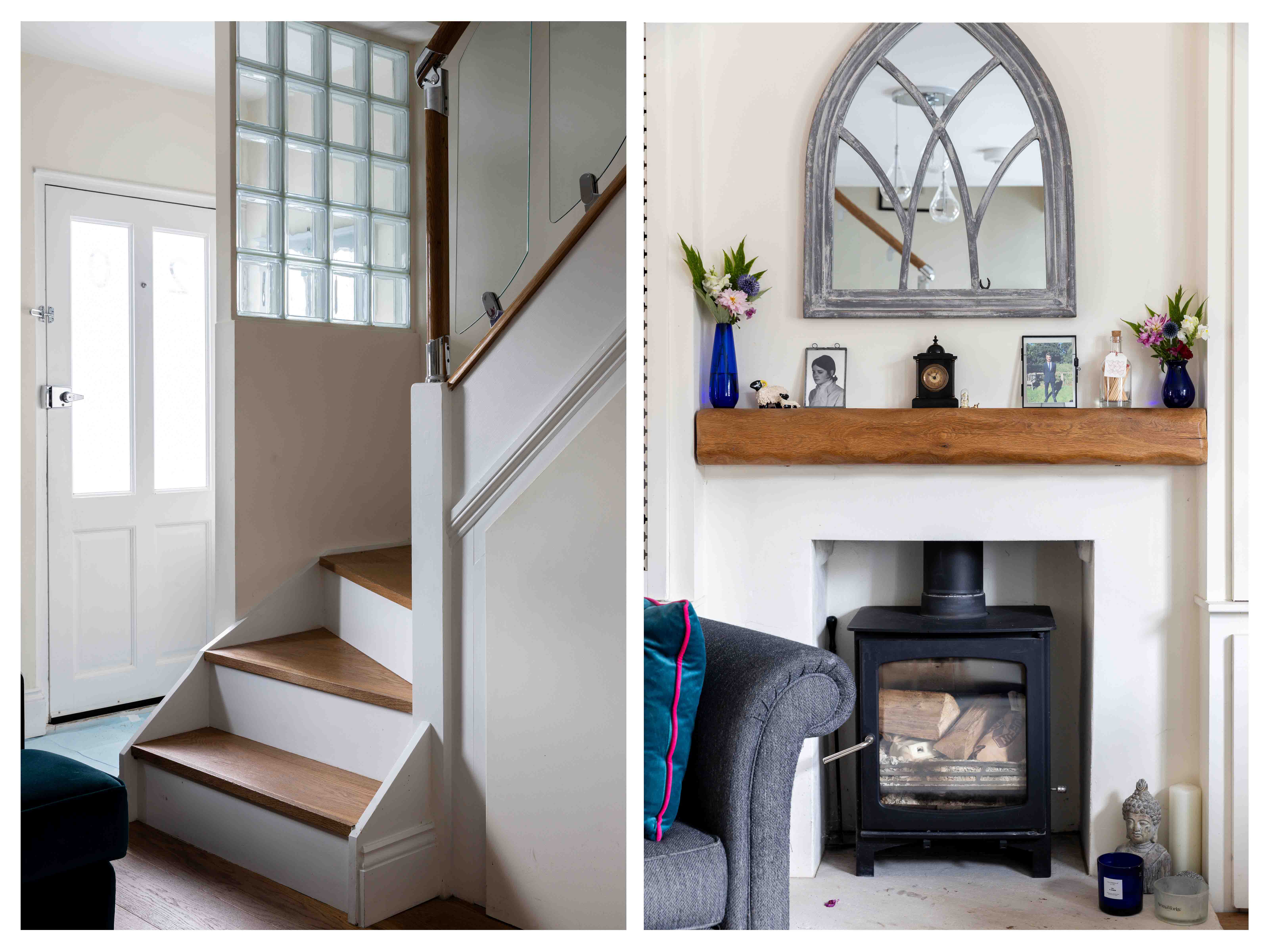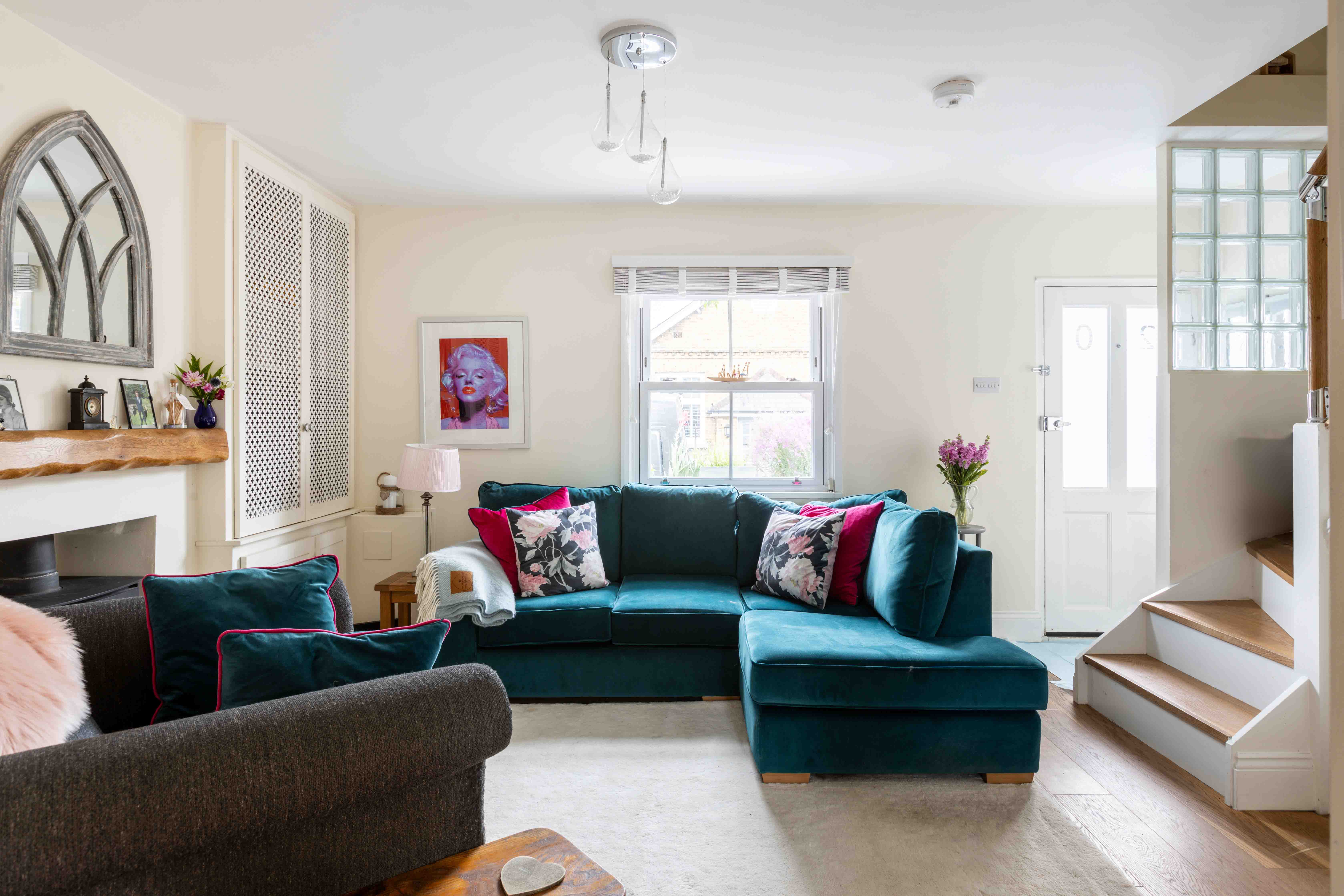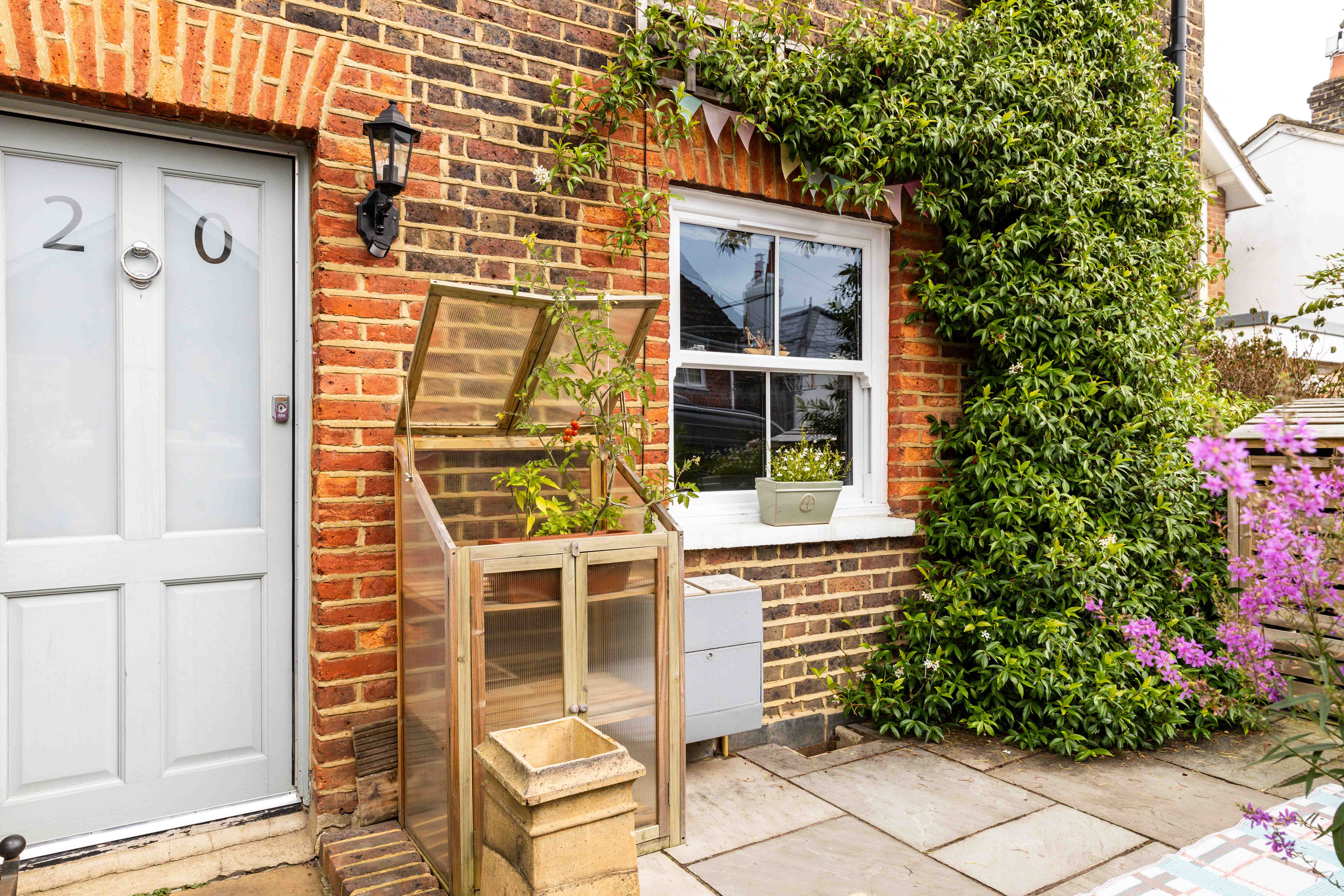The approach is marked by a traditional front door, charmingly positioned within a brick wall that encloses a thoughtfully maintained front garden. Stepping inside, the double reception room impresses with its spacious layout, where barn doors subtly divide the cosy living room and elegant dining area. The living room is a warm and inviting space, featuring a log burner and bespoke built-in cabinetry, while the dining room offers seamless outdoor access, perfect for al-fresco dining on the private patio. At the rear of the home is the 25ft kitchen—a beautifully designed space that blends style and practicality. Glossy shaker-style cabinets with oak worktops and classic cup handles create a sophisticated feel, while integrated appliances and ample storage cater to modern needs. French doors flood the kitchen with morning light and lead out to an east-facing garden, ideal for soaking up the sunrise. A convenient downstairs WC completes the ground floor.