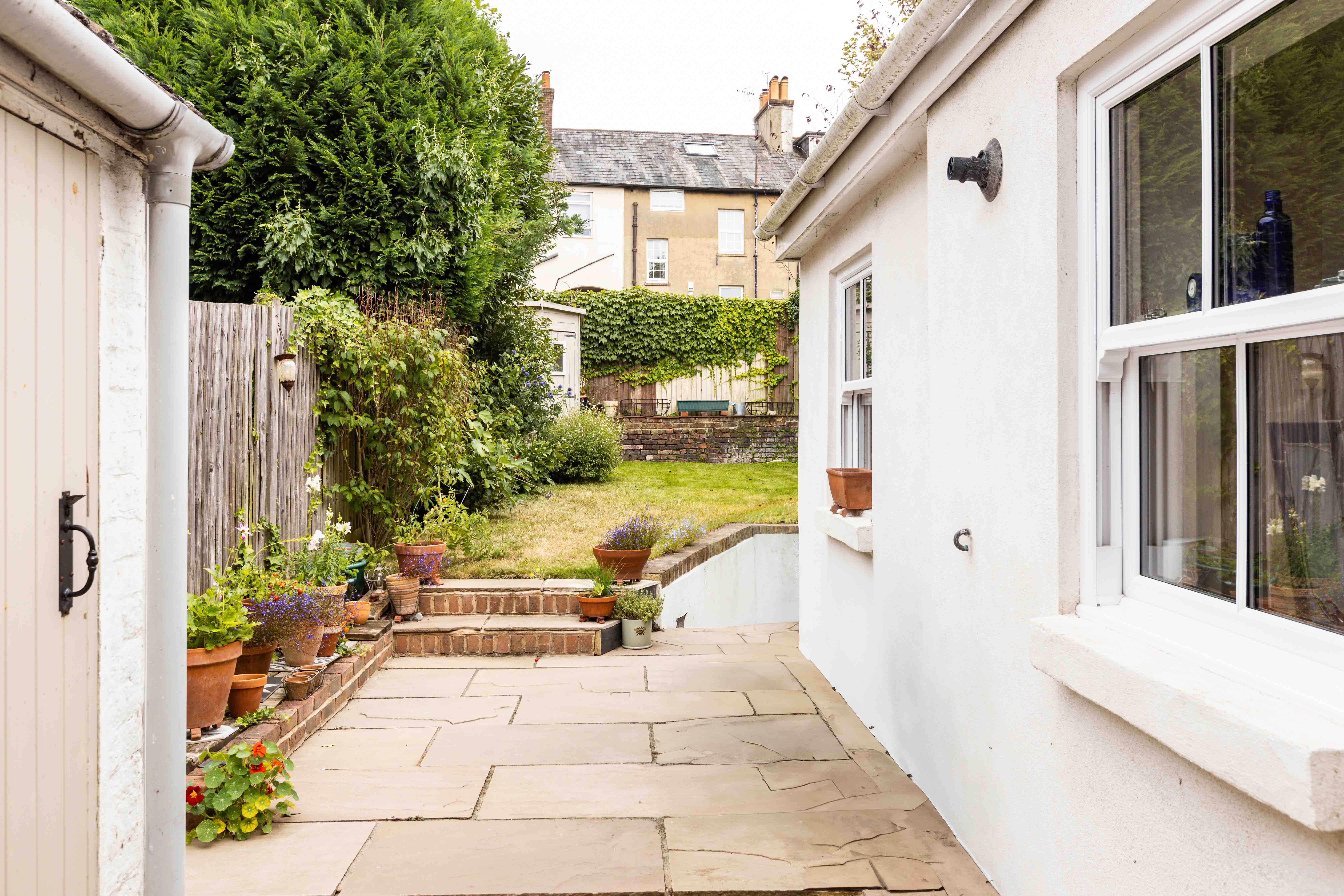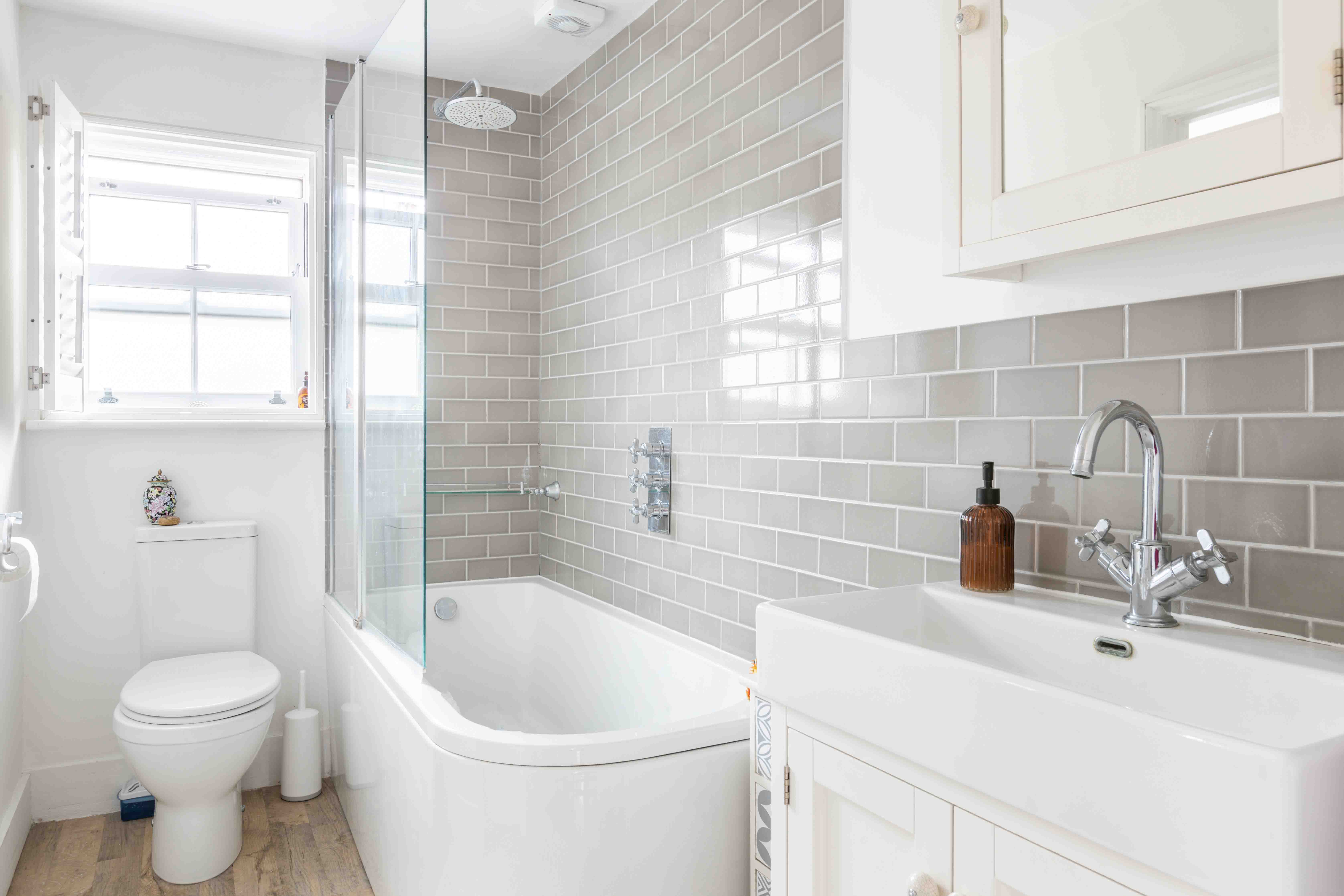 Upstairs, two generously sized double bedrooms share a stylish family bathroom. The principal bedroom is a serene retreat, boasting an original fireplace and a sash window overlooking the characterful surroundings of Lower Road. The second bedroom, with views over the garden, is equally inviting. The bathroom is elegantly appointed, featuring neutral metro tiling, a curved bath, a farmhouse sink, and traditional chrome fixtures. Neutrally decorated throughout, this home offers a bright and spacious feel, perfectly blending Victorian charm with modern living.