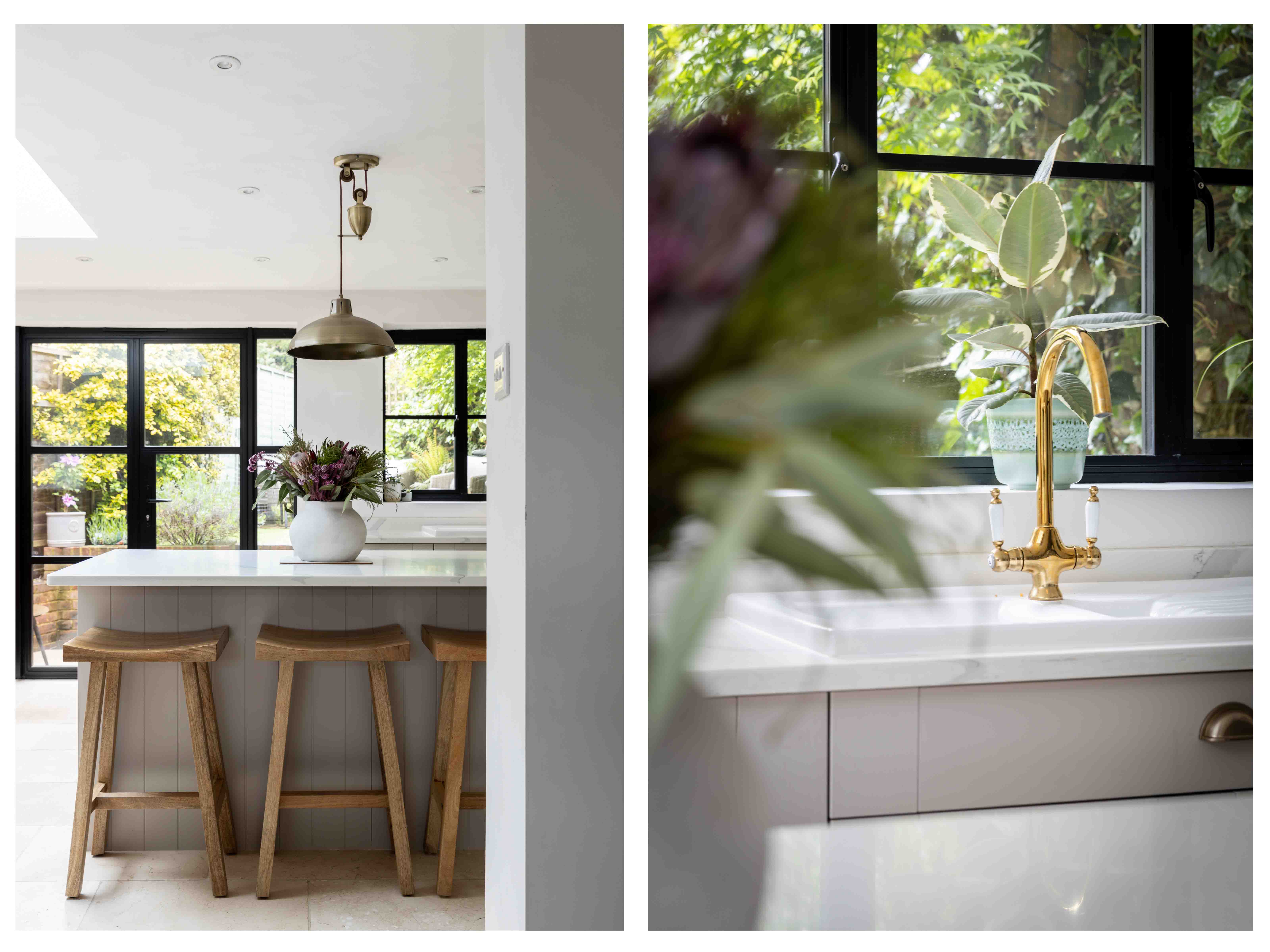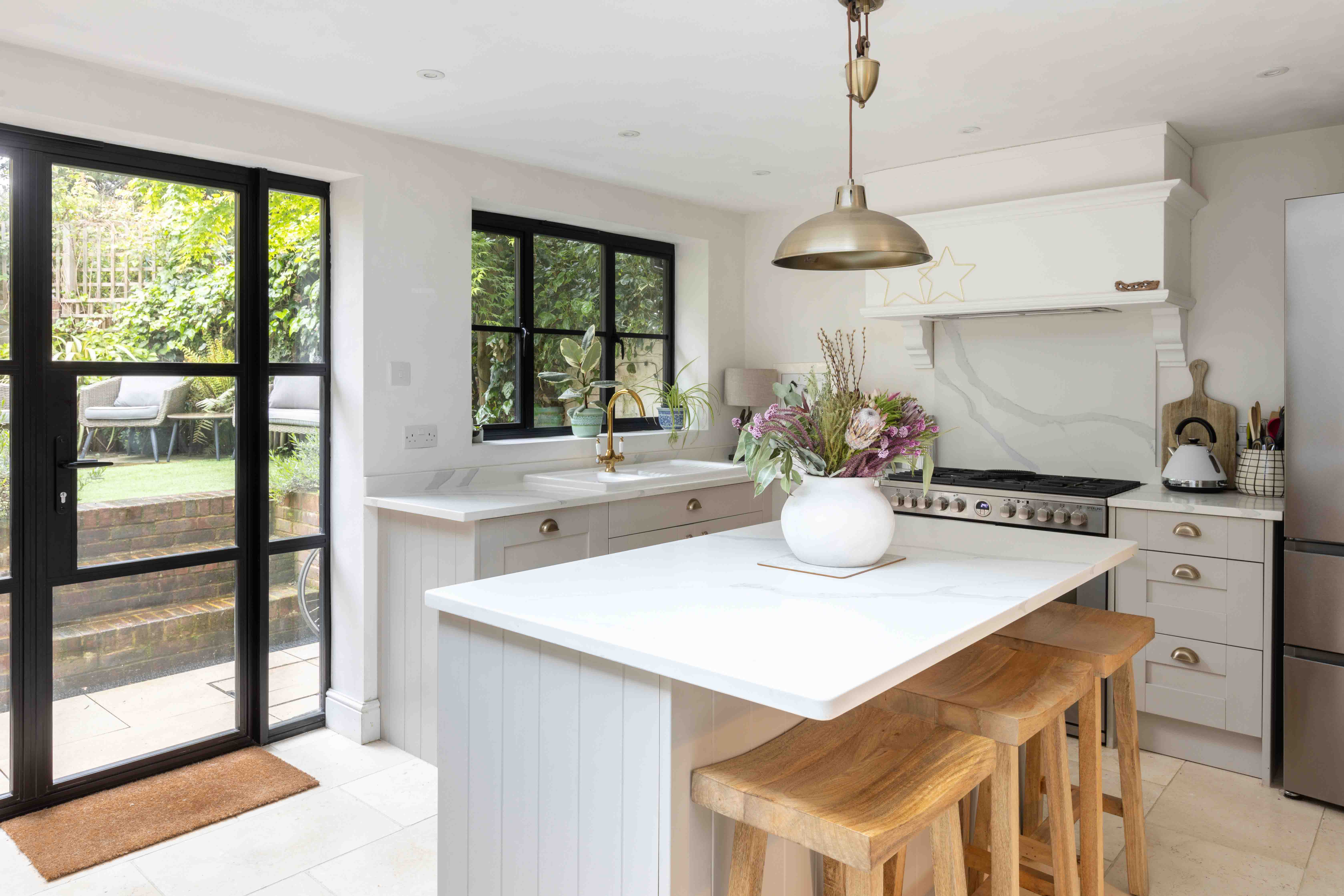 Throughout the home, ornate period features serve as a testament to its rich heritage, from intricate mouldings to original fireplaces, each detail a testament to the craftsmanship of yesteryears. The heart of the home is the modern kitchen extension, where the current owners have created an open plan kitchen and dining room, that seamlessly blends Victorian character with contemporary function. The neutral kitchen is placed around a central island, and black critical-style doors open onto the garden.