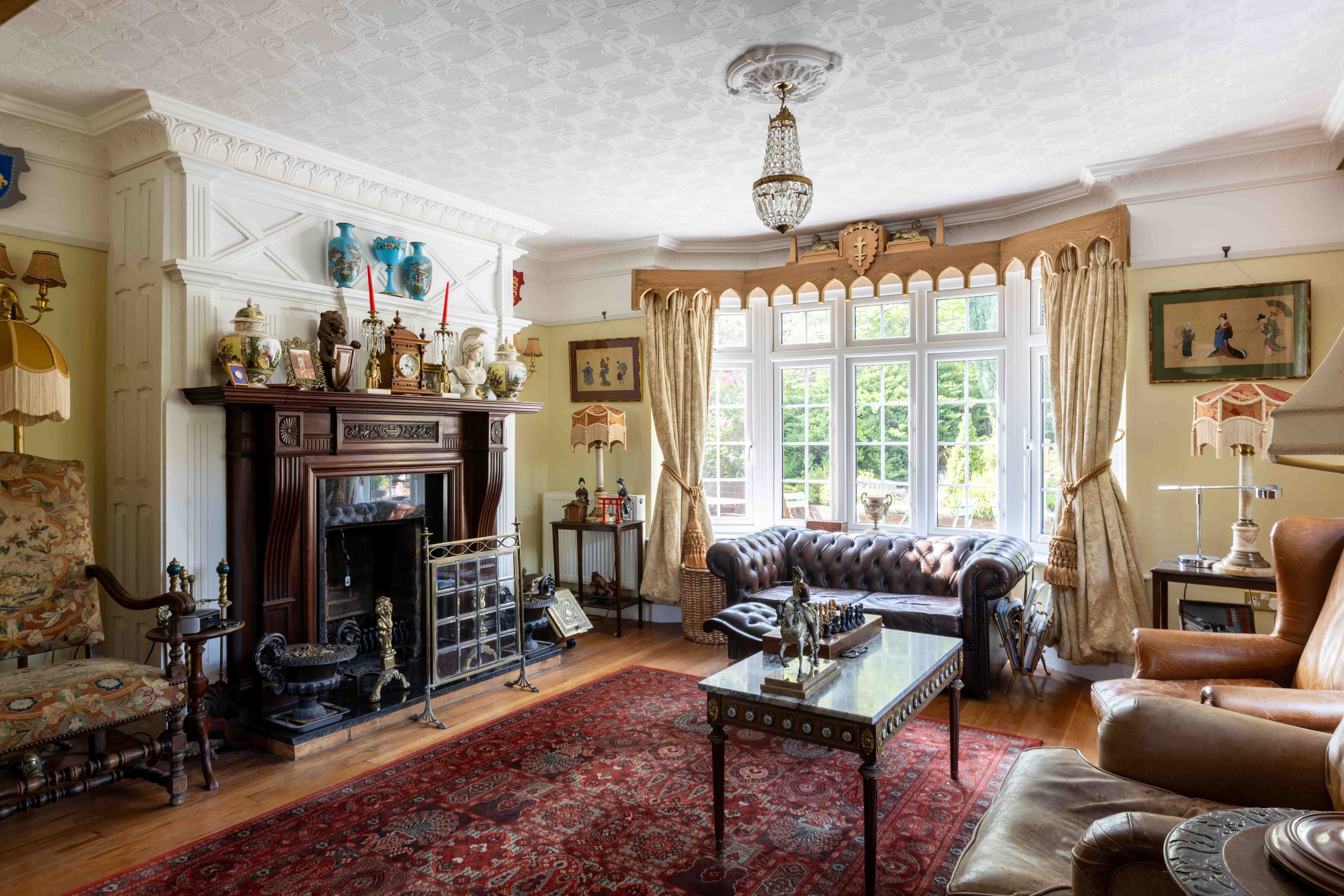 Grand reception room with soaring ceiling, grand fireplace and expansive bay window