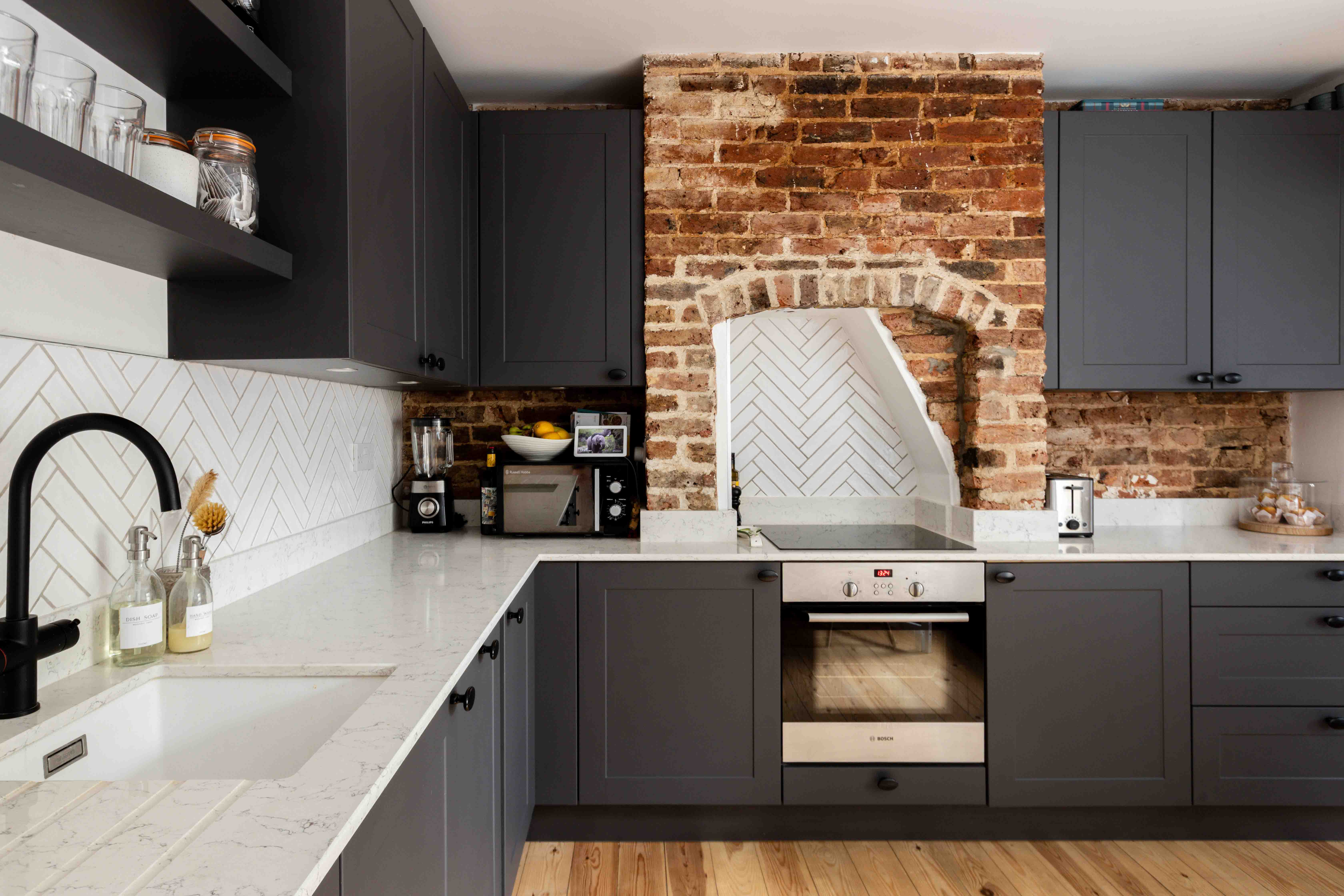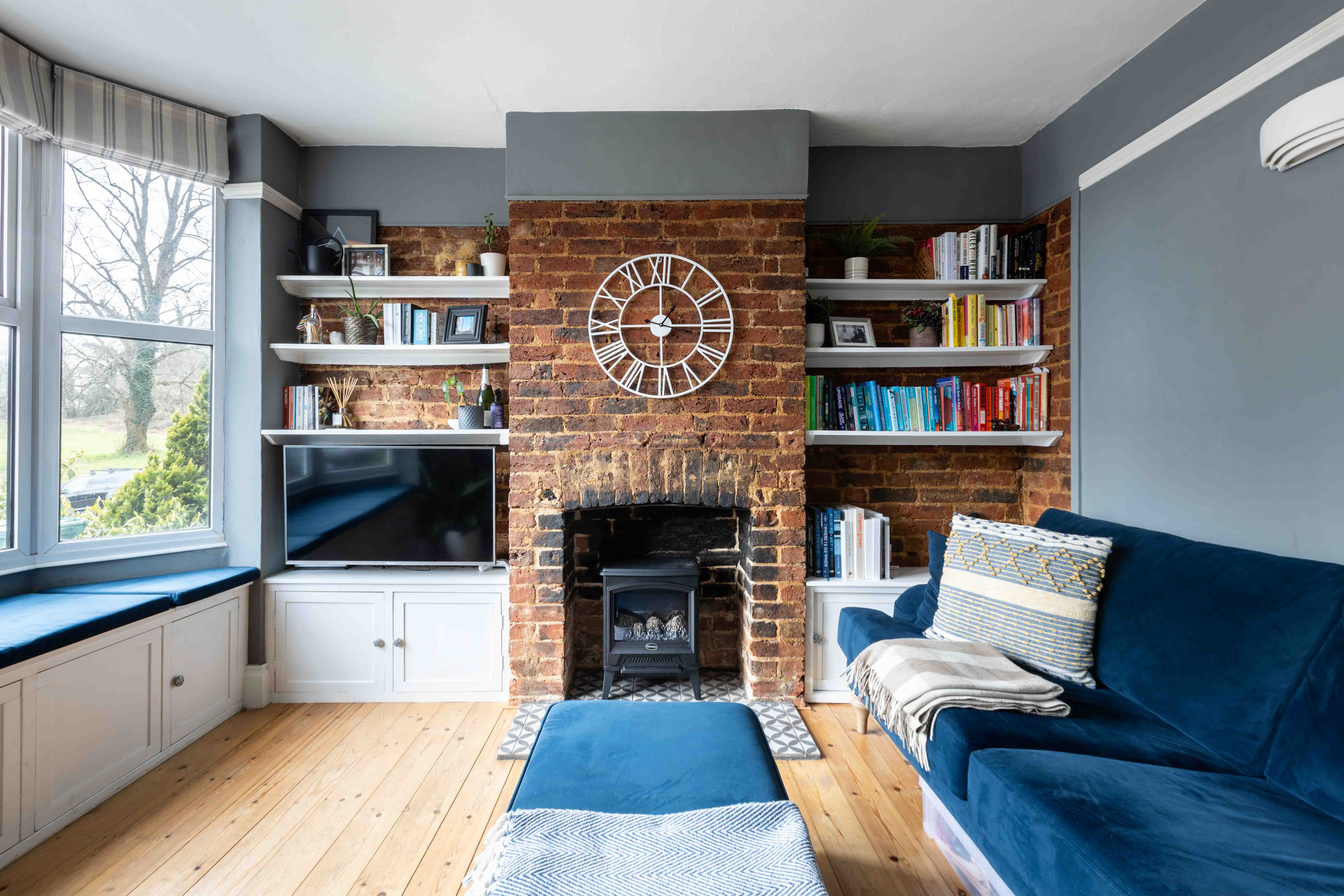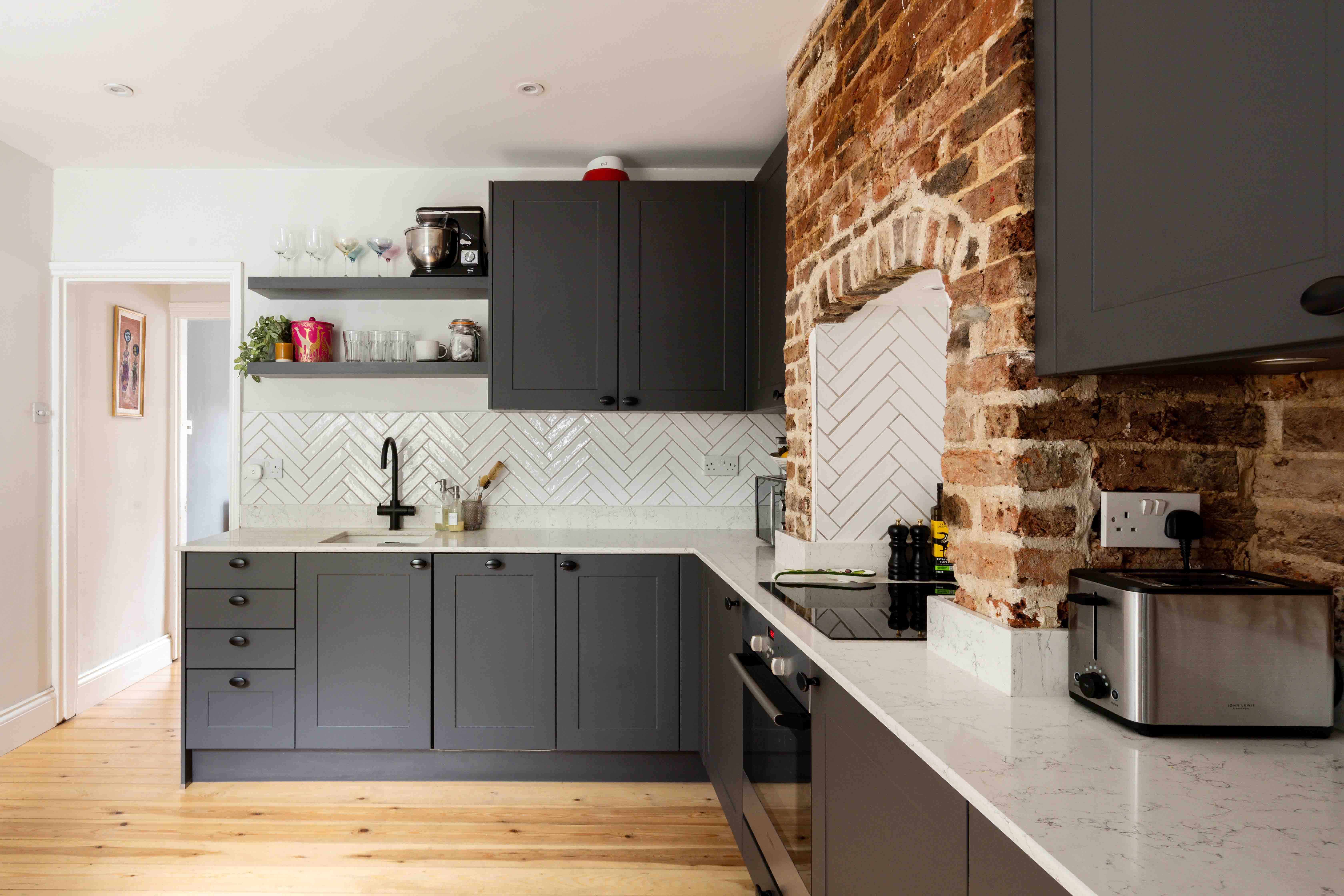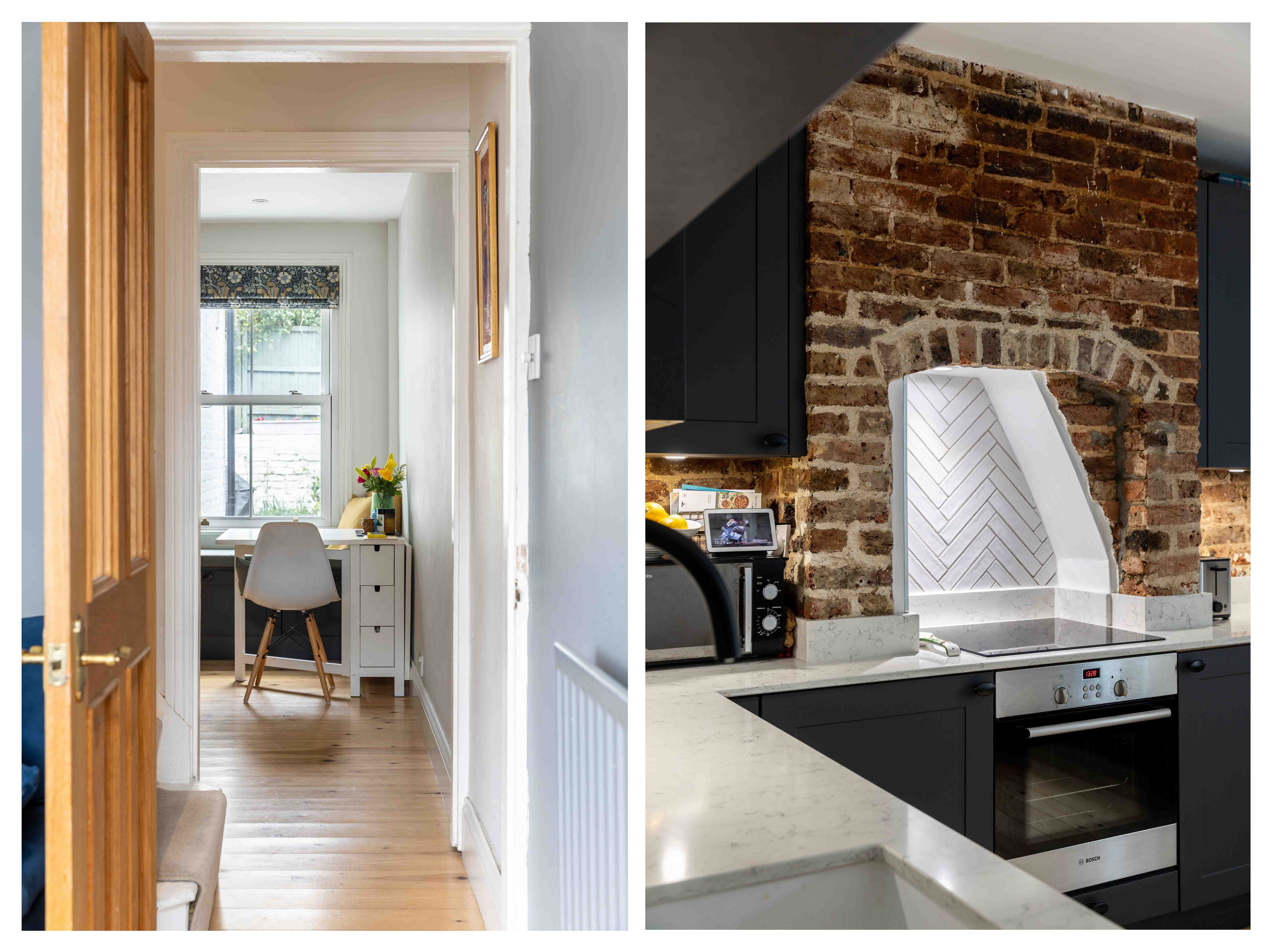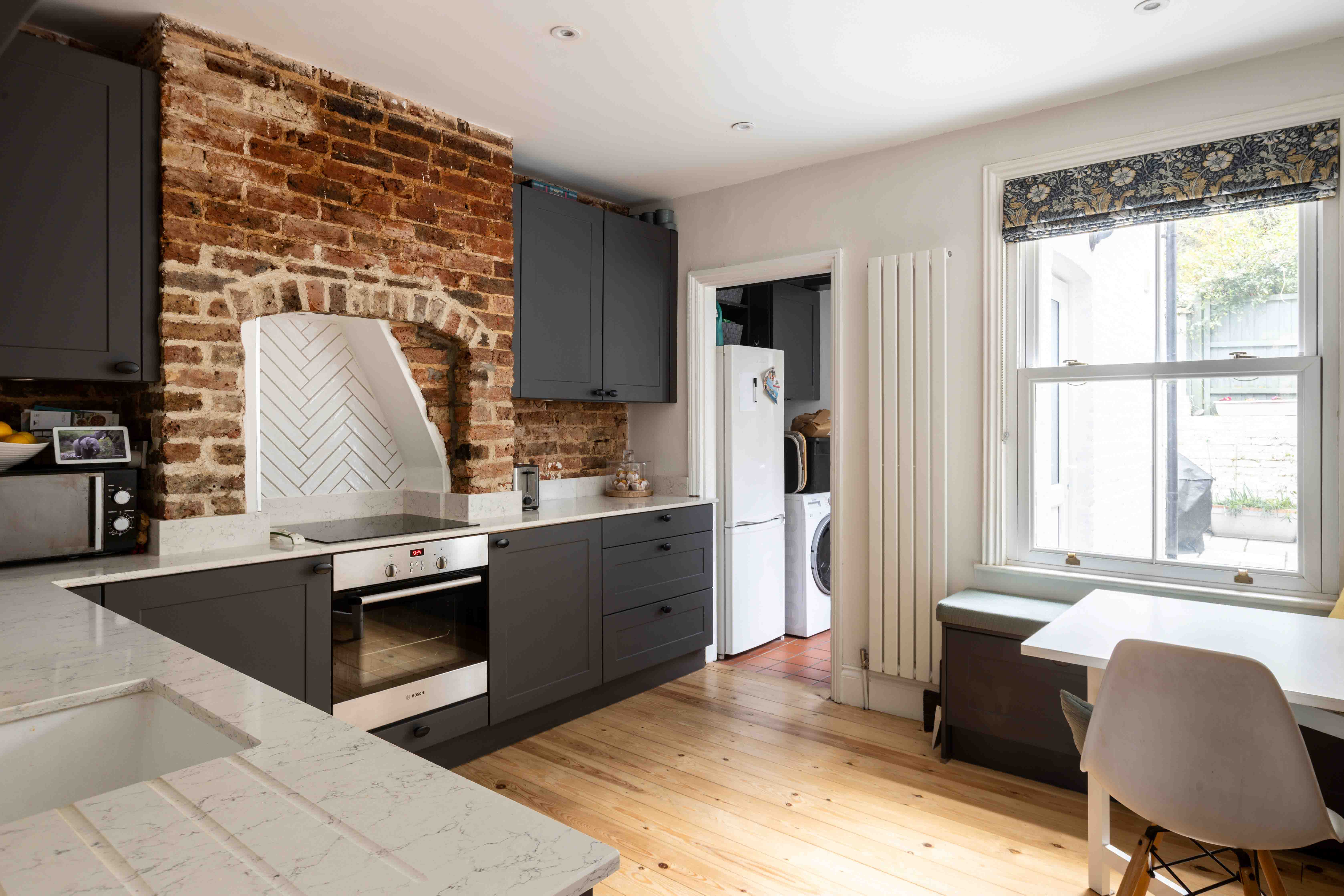 Step inside, and the front reception room immediately delights with its bay window and built-in window seat, bathing the space in natural light. An exposed brick chimney breast makes a bold statement, complemented by an electric burner and a tiled fireplace—the perfect setting for cosy evenings. Thoughtfully designed bespoke cabinetry flanks the chimney, creating a seamless balance of function and charm. From the reception, the oak flooring flows effortlessly into the kitchen diner—a stunning space where modern design meets period character. The grey shaker cabinetry is paired beautifully with quartz worktops, while the exposed brick rear wall and chimney breast continue the home’s timeless aesthetic.