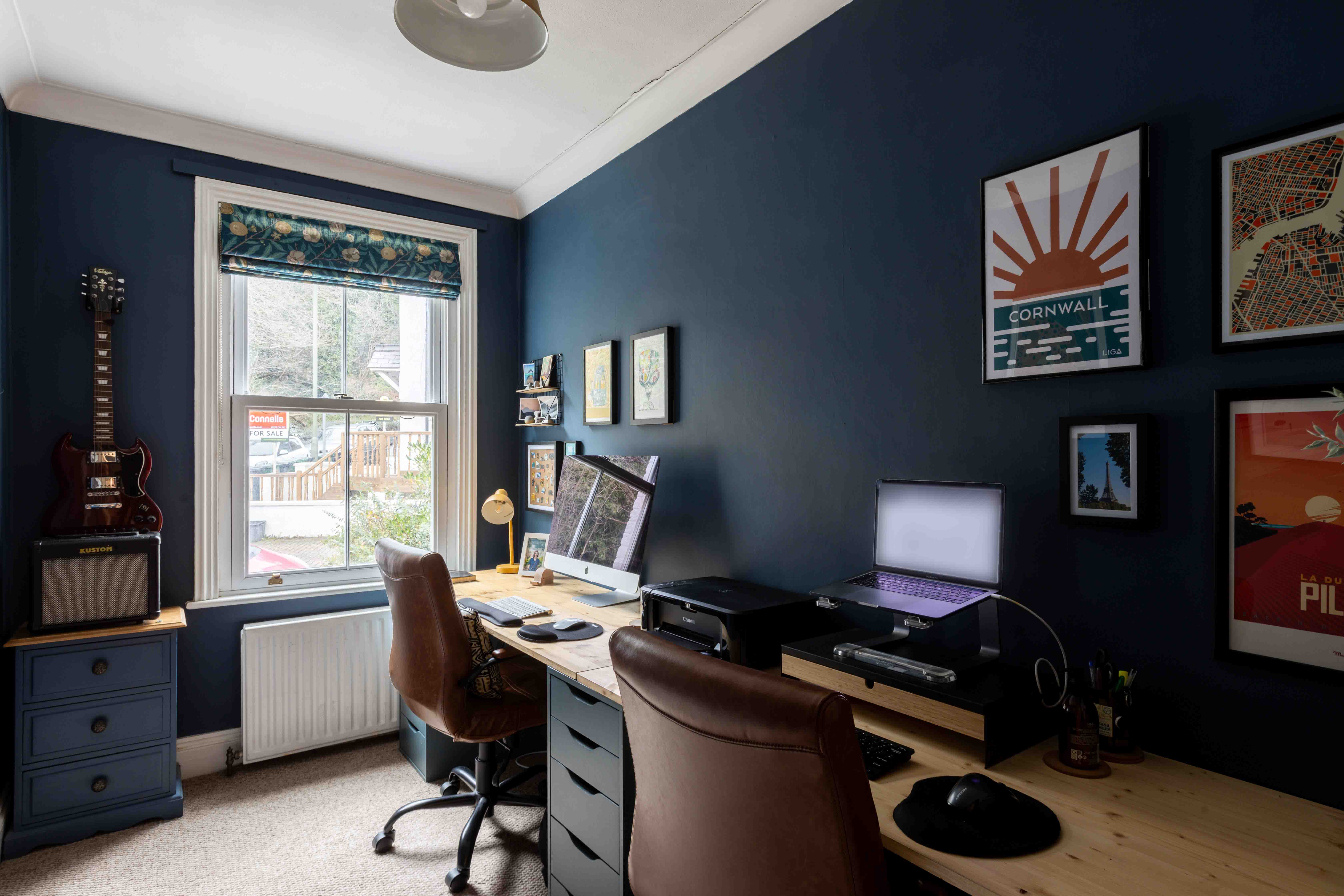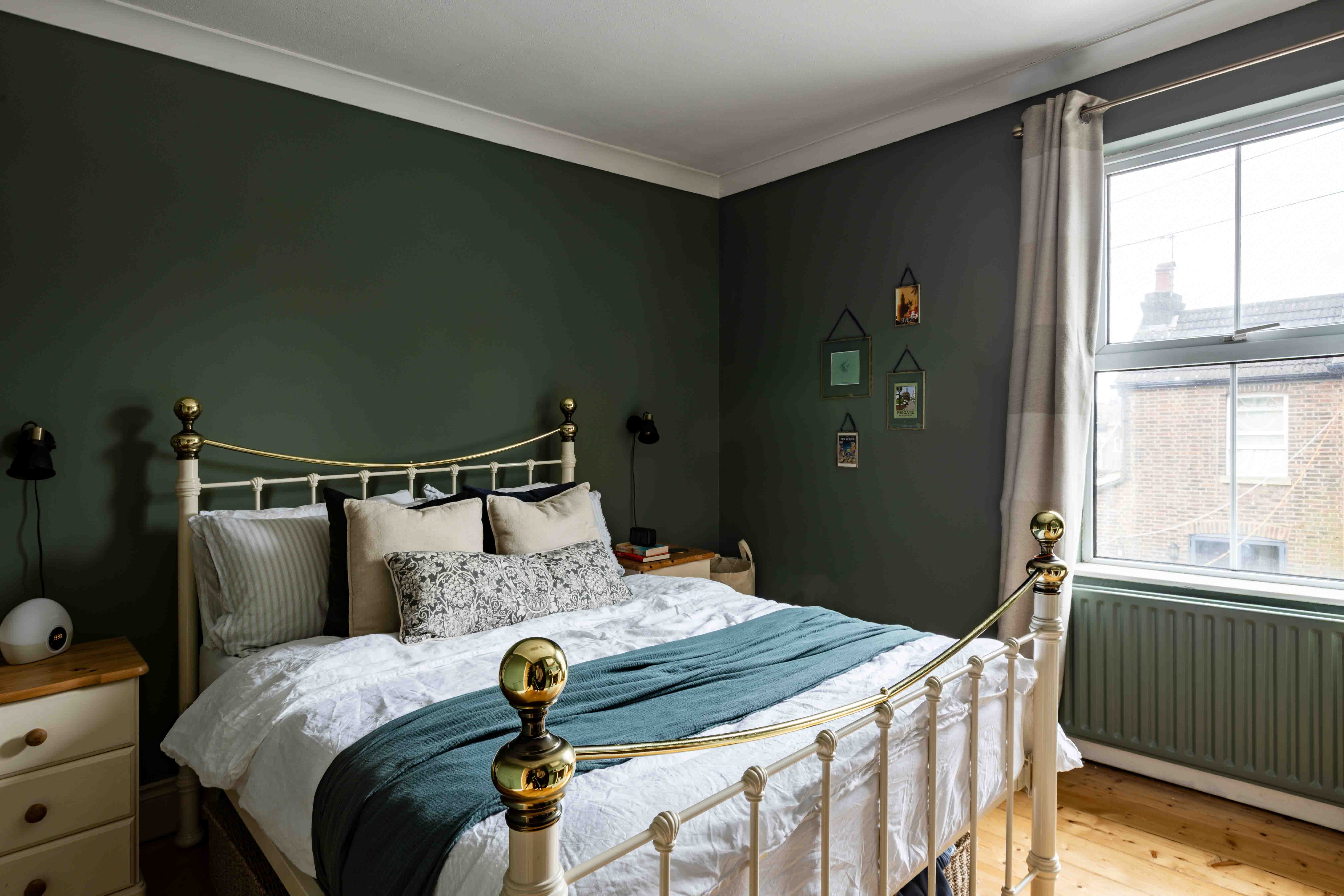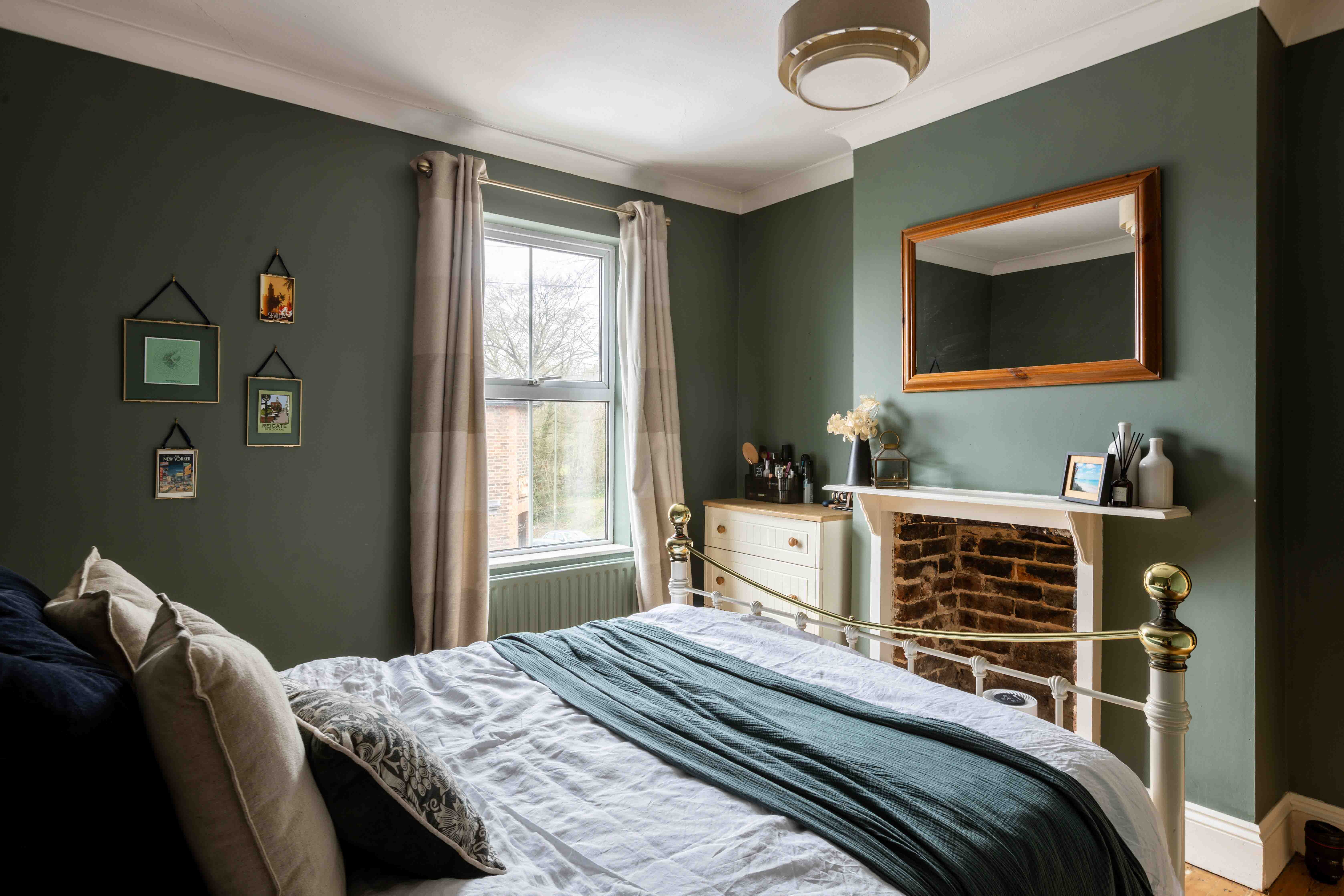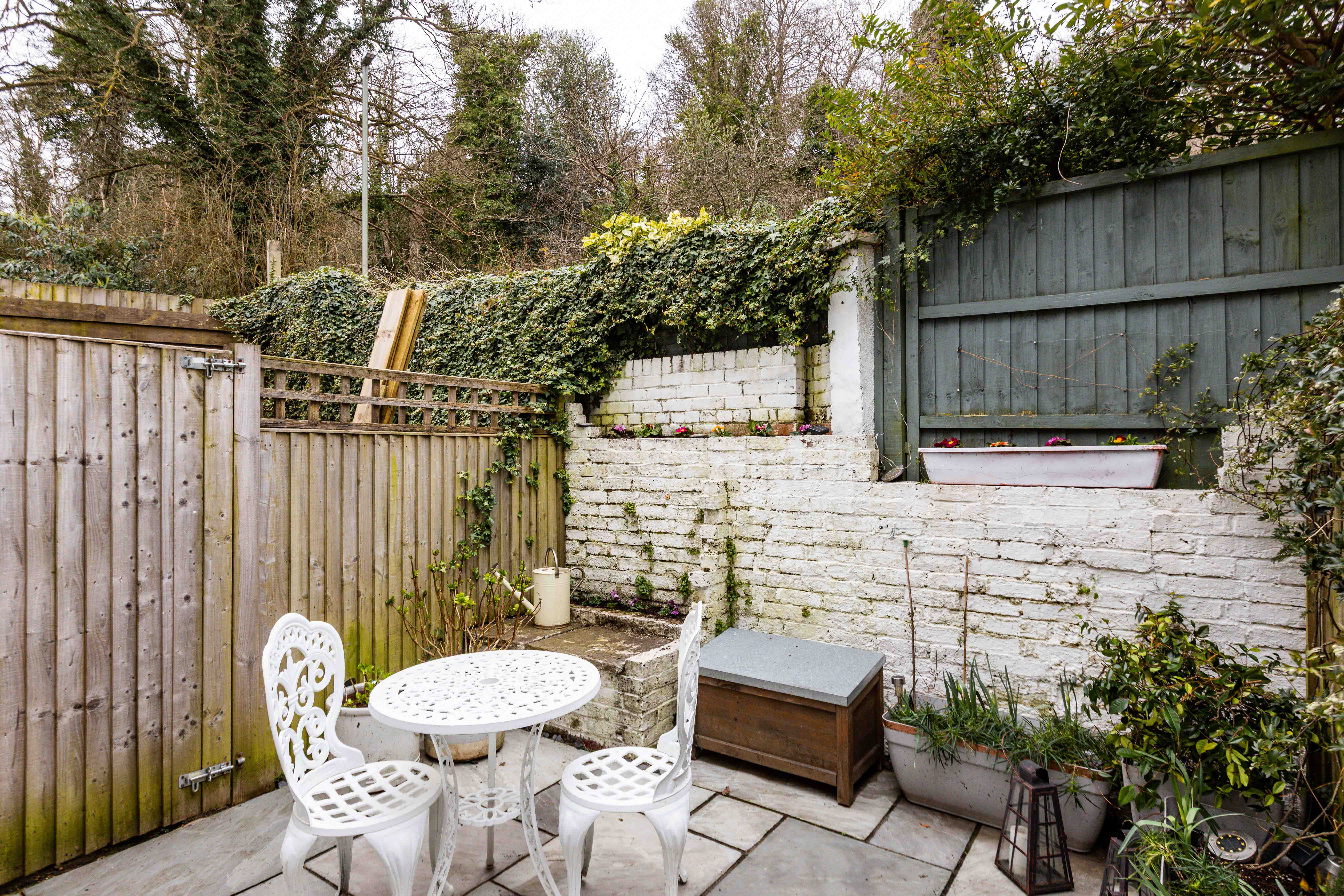 A striking herringbone-patterned white stoneware tile backsplash adds a touch of contemporary flair, and integrated appliances complete the picture of a kitchen designed for both style and practicality. At the rear, the modern bathroom is finished with mint metro tiling and classic chrome hardware, offering a serene, spa-like feel. Outside, the courtyard garden is a hidden gem—its painted brick walls and slate patio create a stylish yet low-maintenance outdoor retreat, perfect for alfresco dining or a morning coffee.