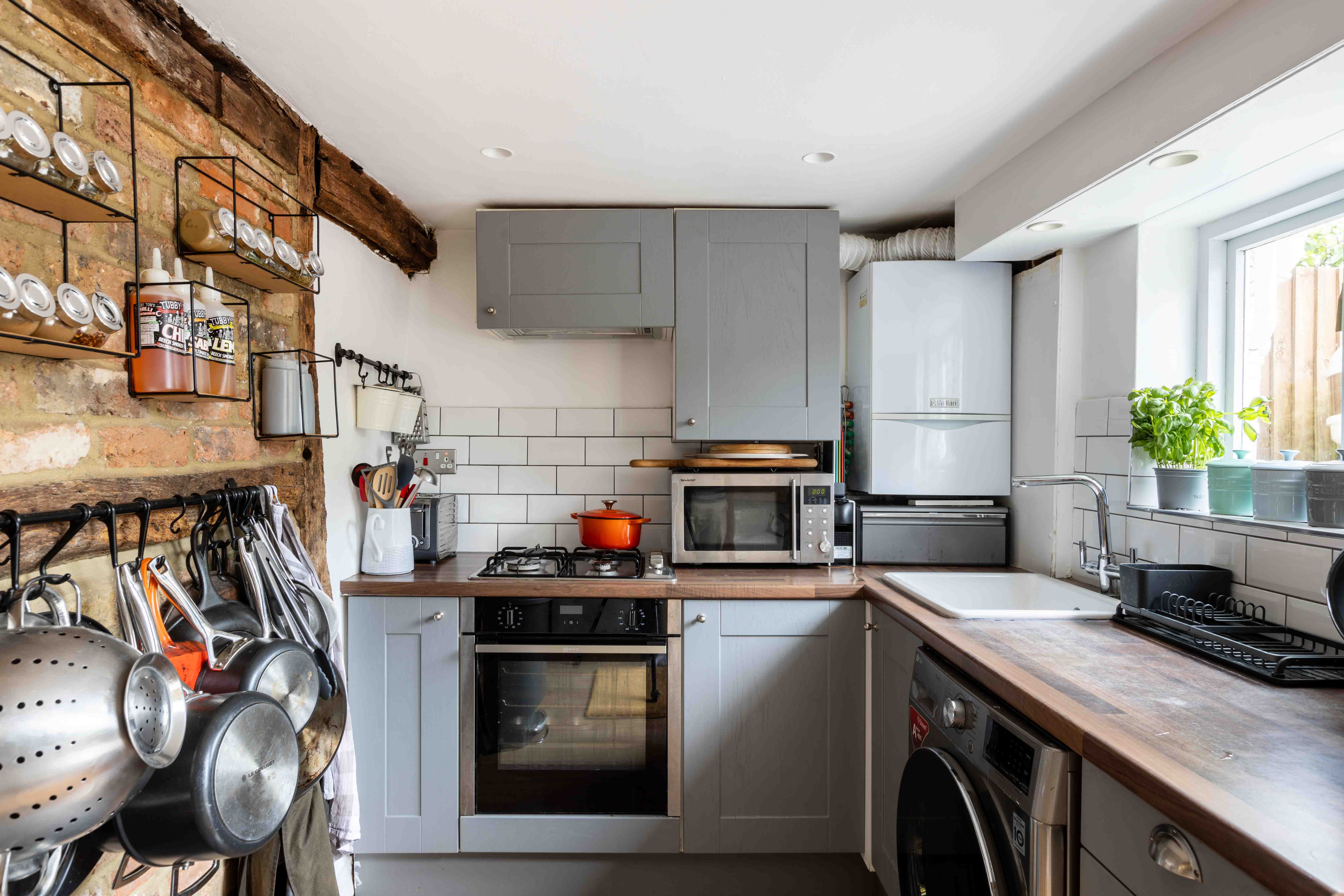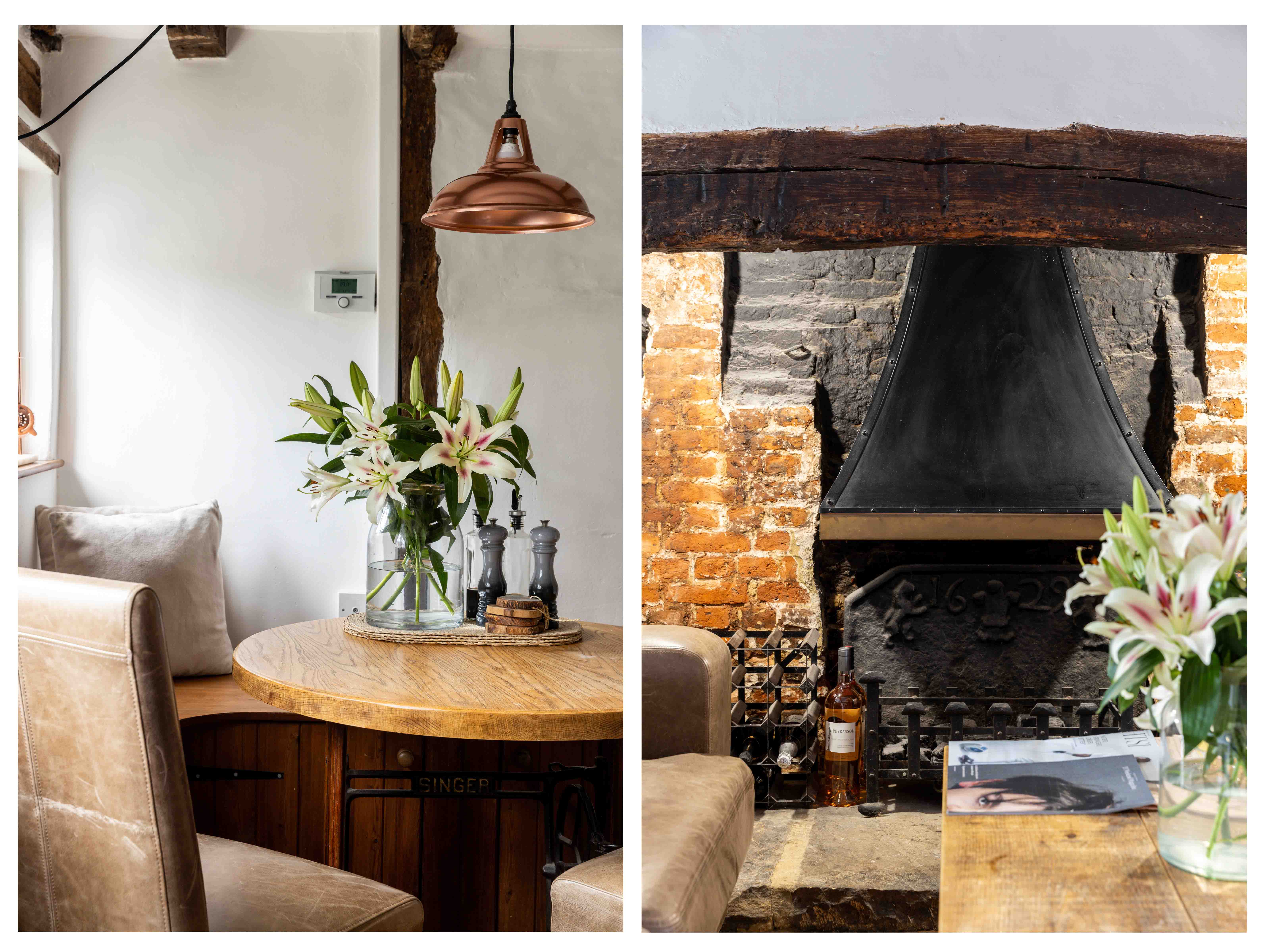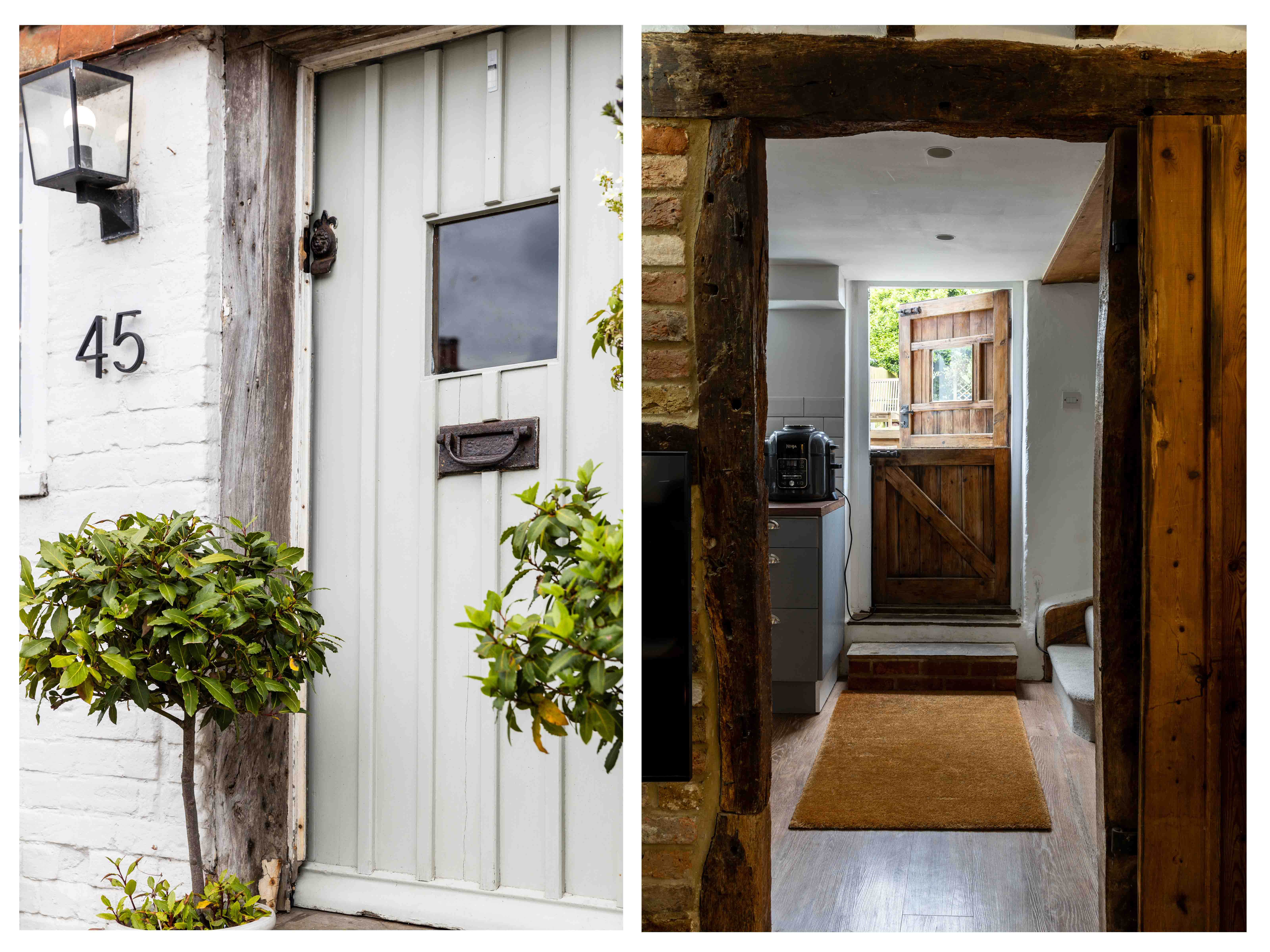Nestled at the edge of Bletchingley’s picturesque high street, No. 45 is a quintessential two bedroom cottage that exudes character and charm. As you step into the inviting living room, you are immediately embraced by the warmth of a large inglenook fireplace. This striking centrepiece, with its stone base and exposed brick, is not just a nod to the cottage’s storied past but also a functional working fire that promises cosy winter evenings. Outside, the garden has been transformed to create a gorgeous outdoor dining area, before steps ascend to the immaculate raised lawn, ideal for catching the sun.