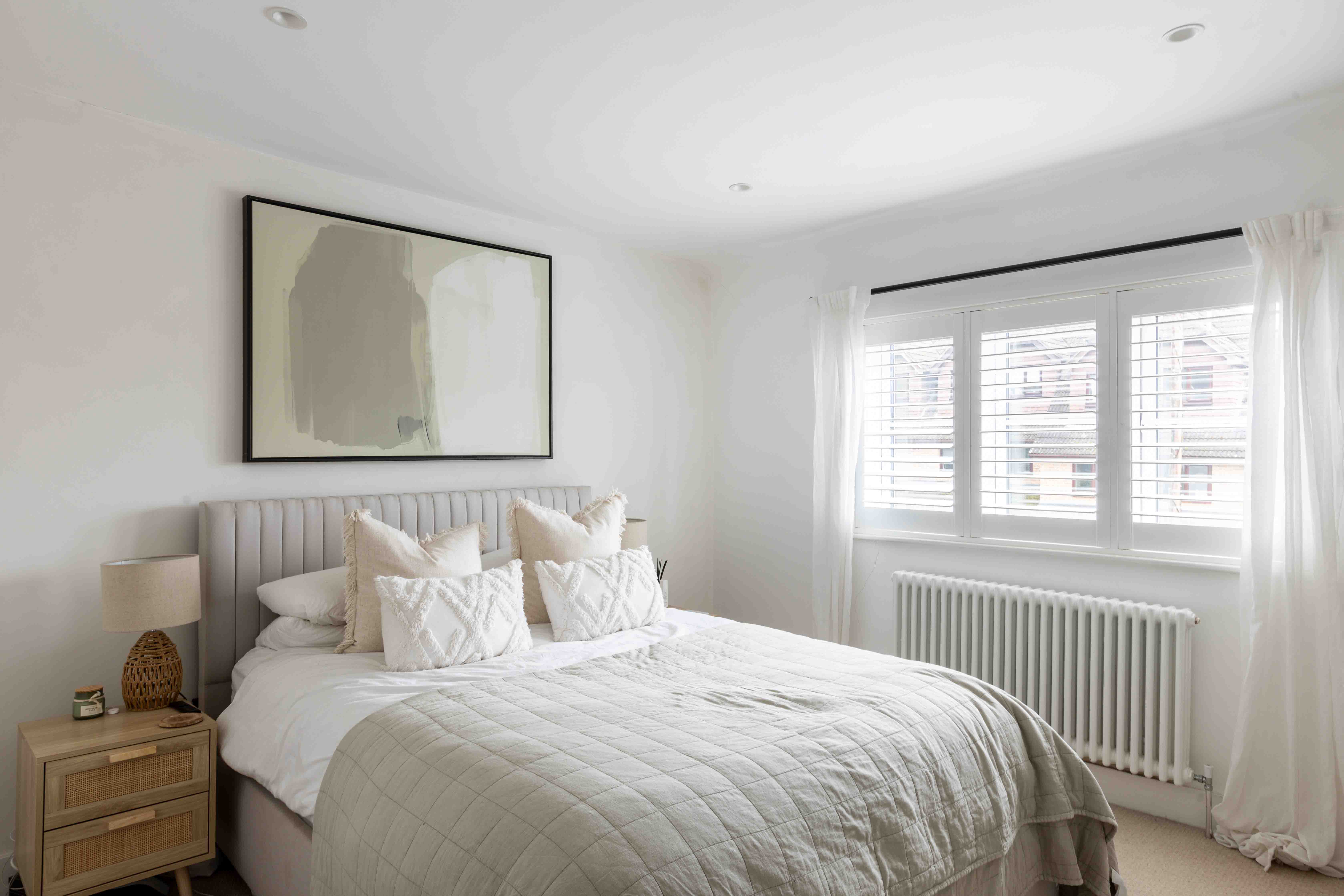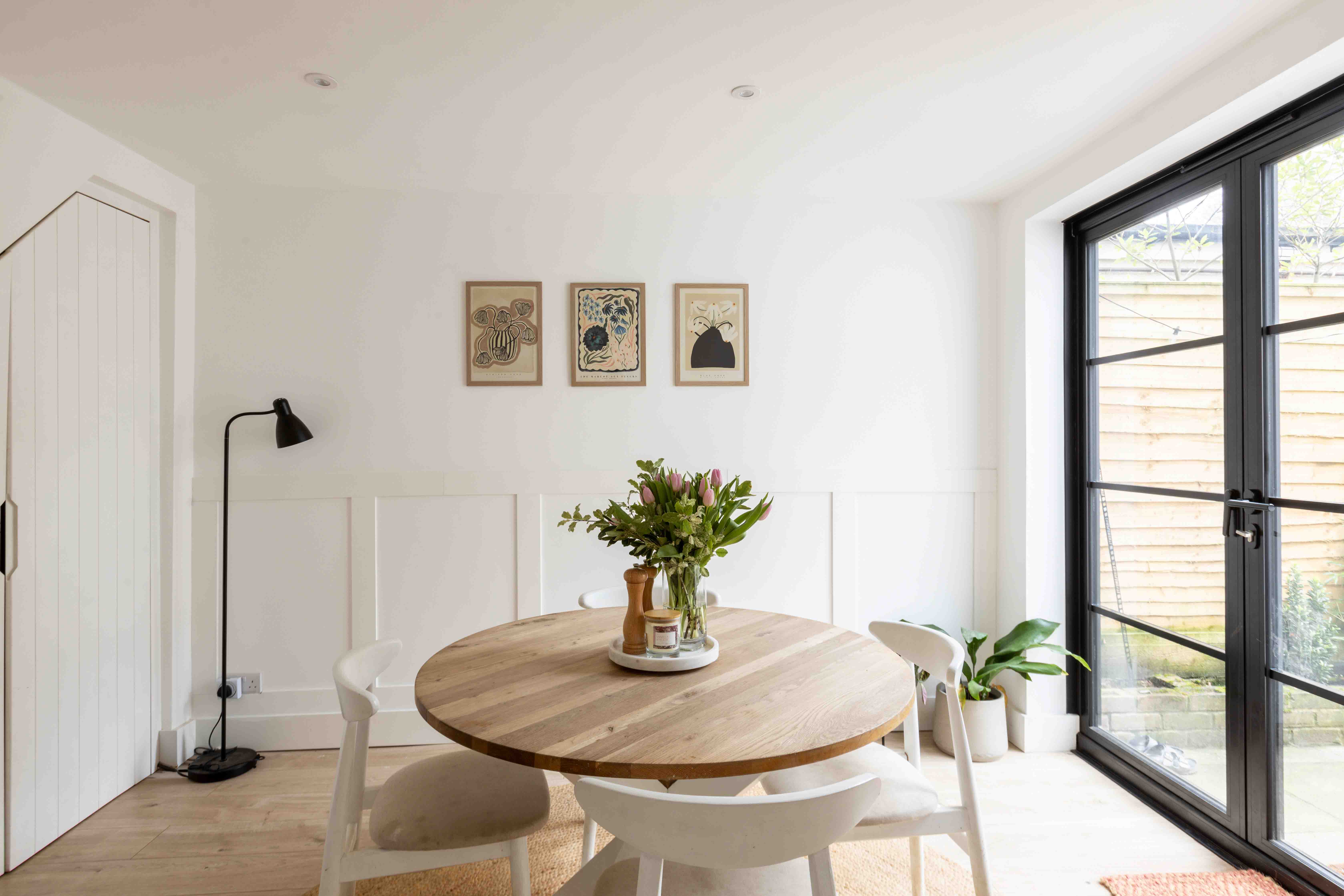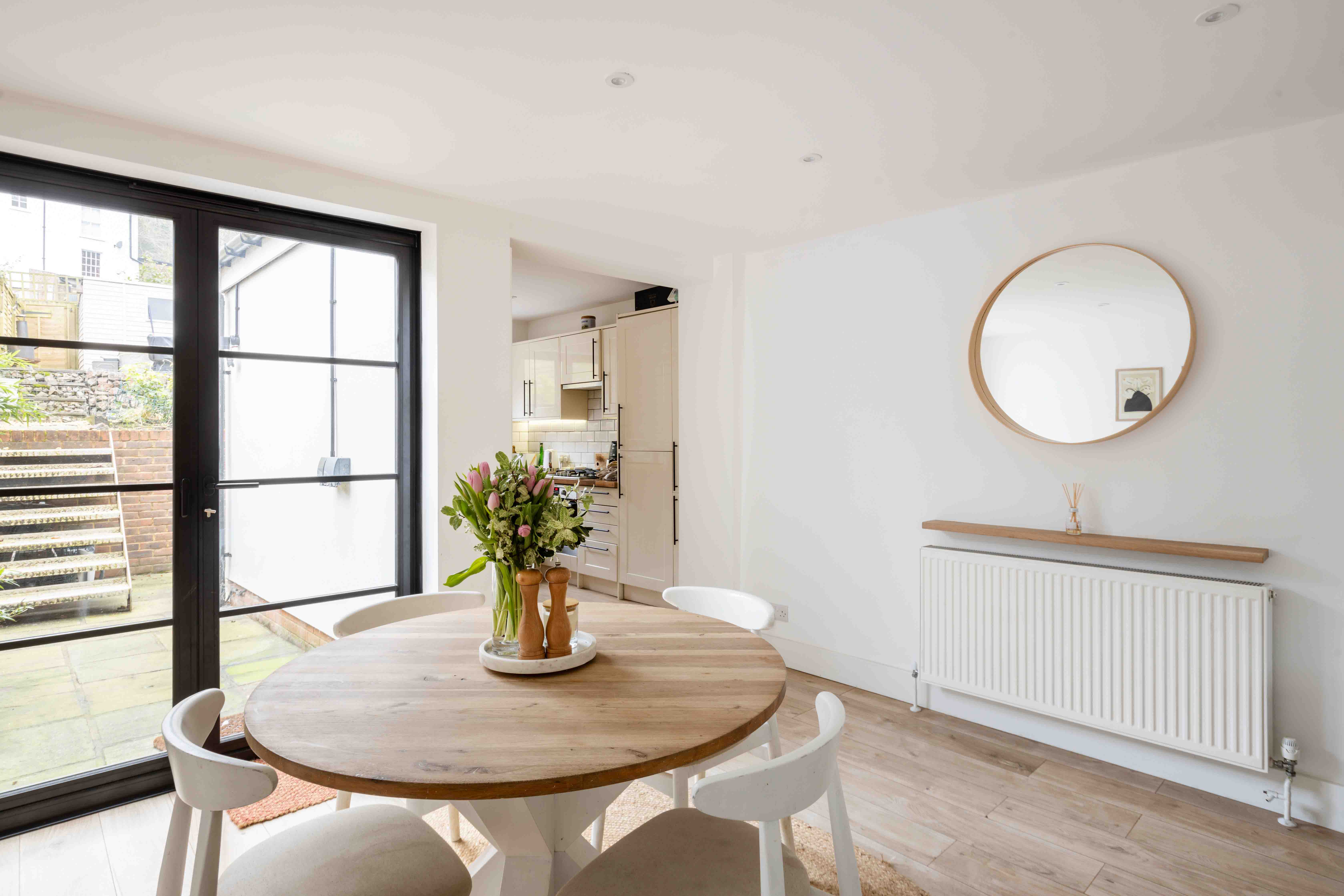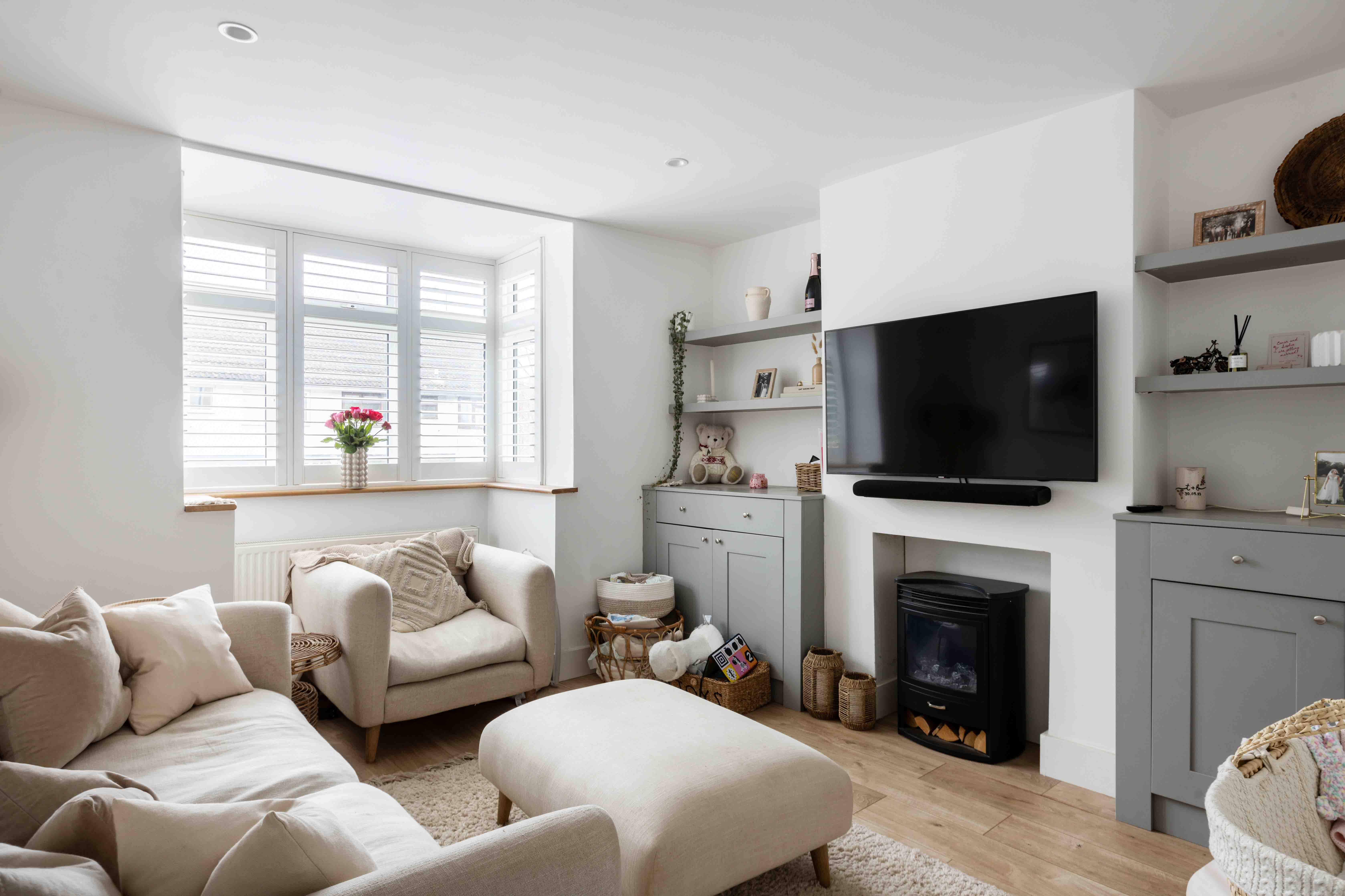 Inside, the front reception room is flooded with natural light through a large box bay window. The neutral tones, cosy burner, and classic detailing create an inviting space perfect for relaxation. The rear reception room takes on a more contemporary aesthetic, with a striking panelled feature wall, crisp white tones, and crittal-style doors opening onto a landscaped patio. The adjoining kitchen overlooks the garden and offers a practical yet stylish workspace with integrated appliances, neutral shaker cabinetry, metro tiling, and oak worktops. The west-facing landscaped garden has been thoughtfully designed with tiered levels to maximize sunlight throughout the day, making it perfect for outdoor living and enjoying breathtaking sunsets. Upstairs, the double bedroom features charming shutters and a brand-new radiator, while a second single room provides convenient storage and tranquil views of the garden. The family bathroom is beautifully designed, featuring textured stone tiling, modern black hardware, a floating oak sink, and sleek white sanitary ware.