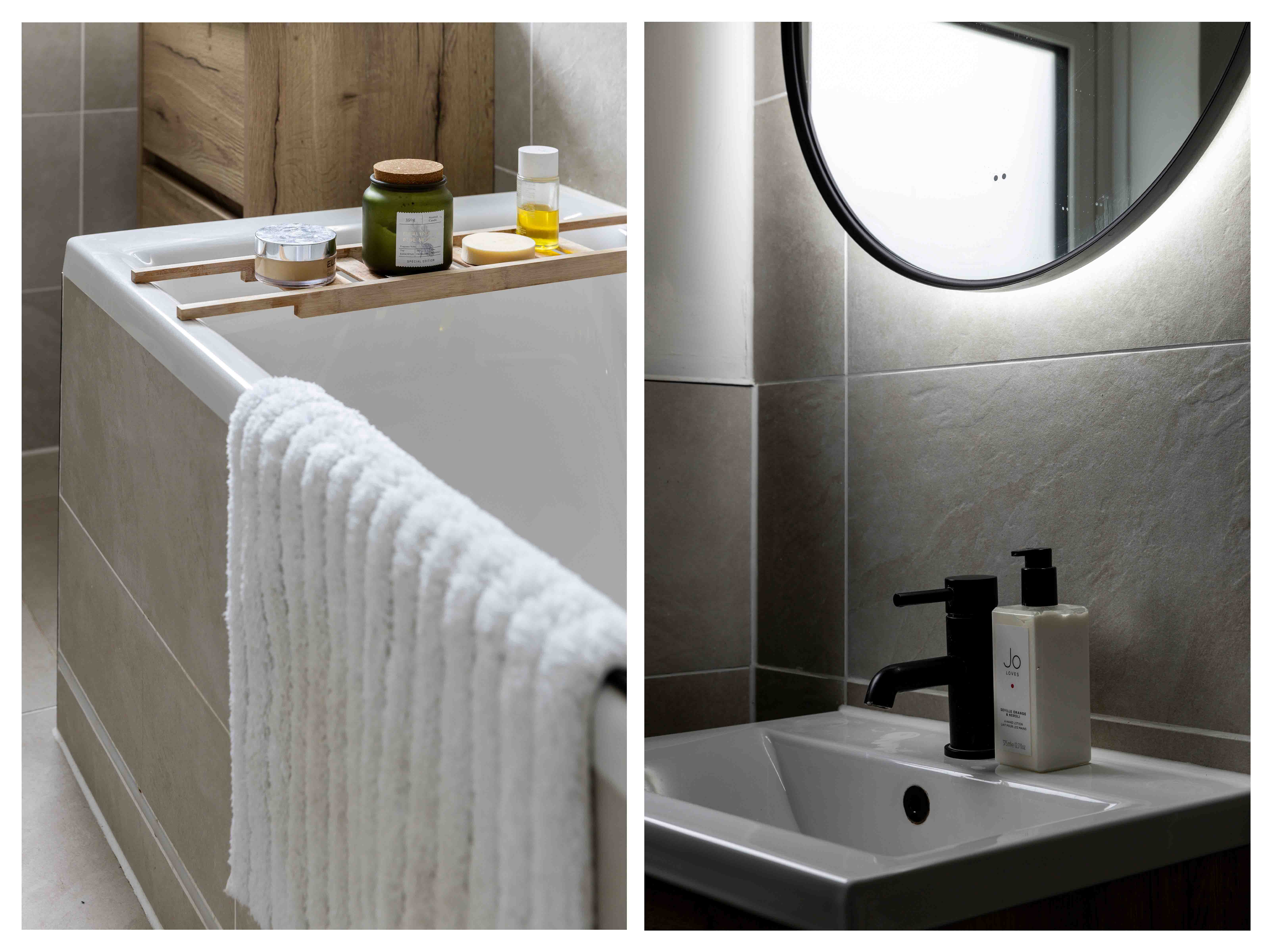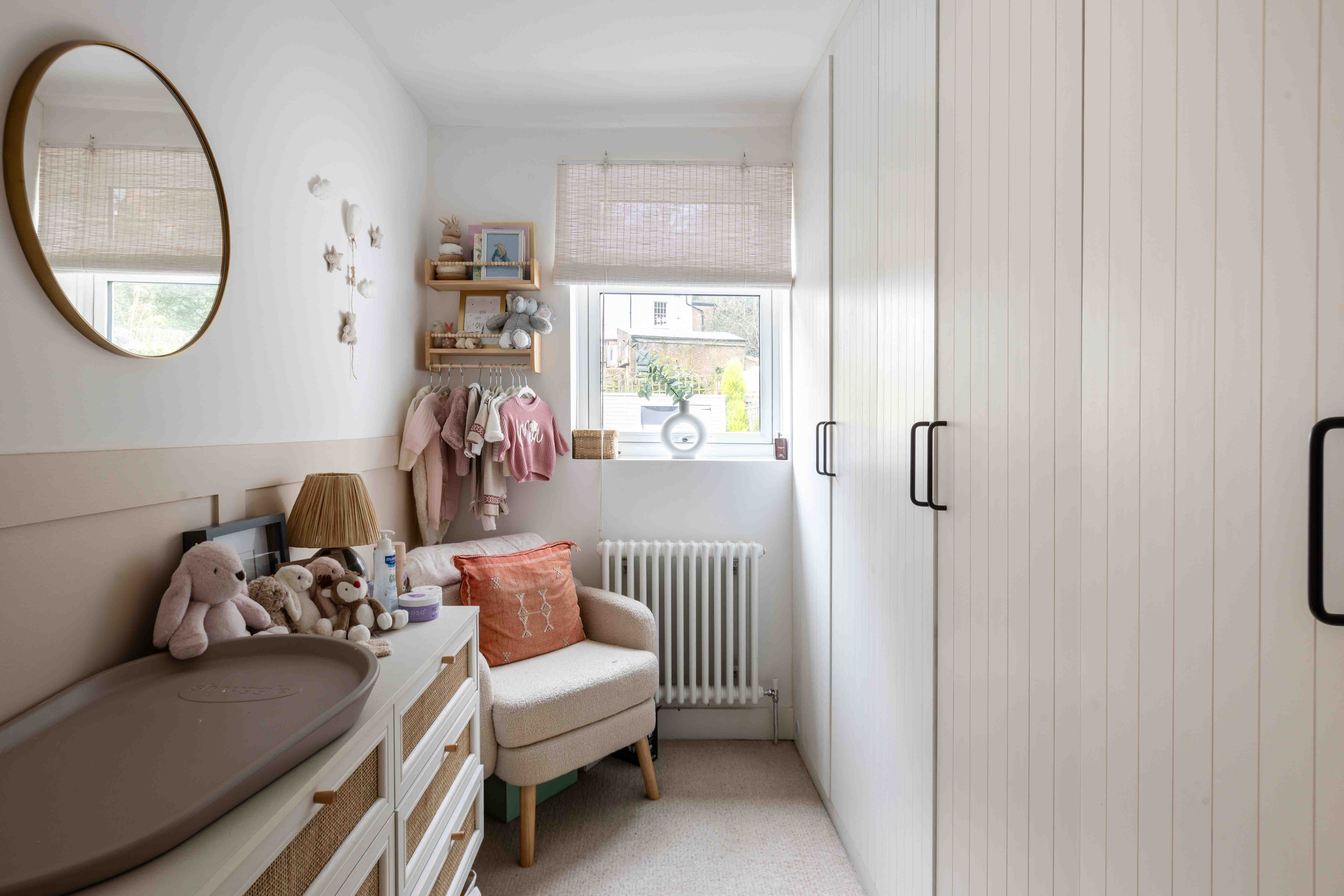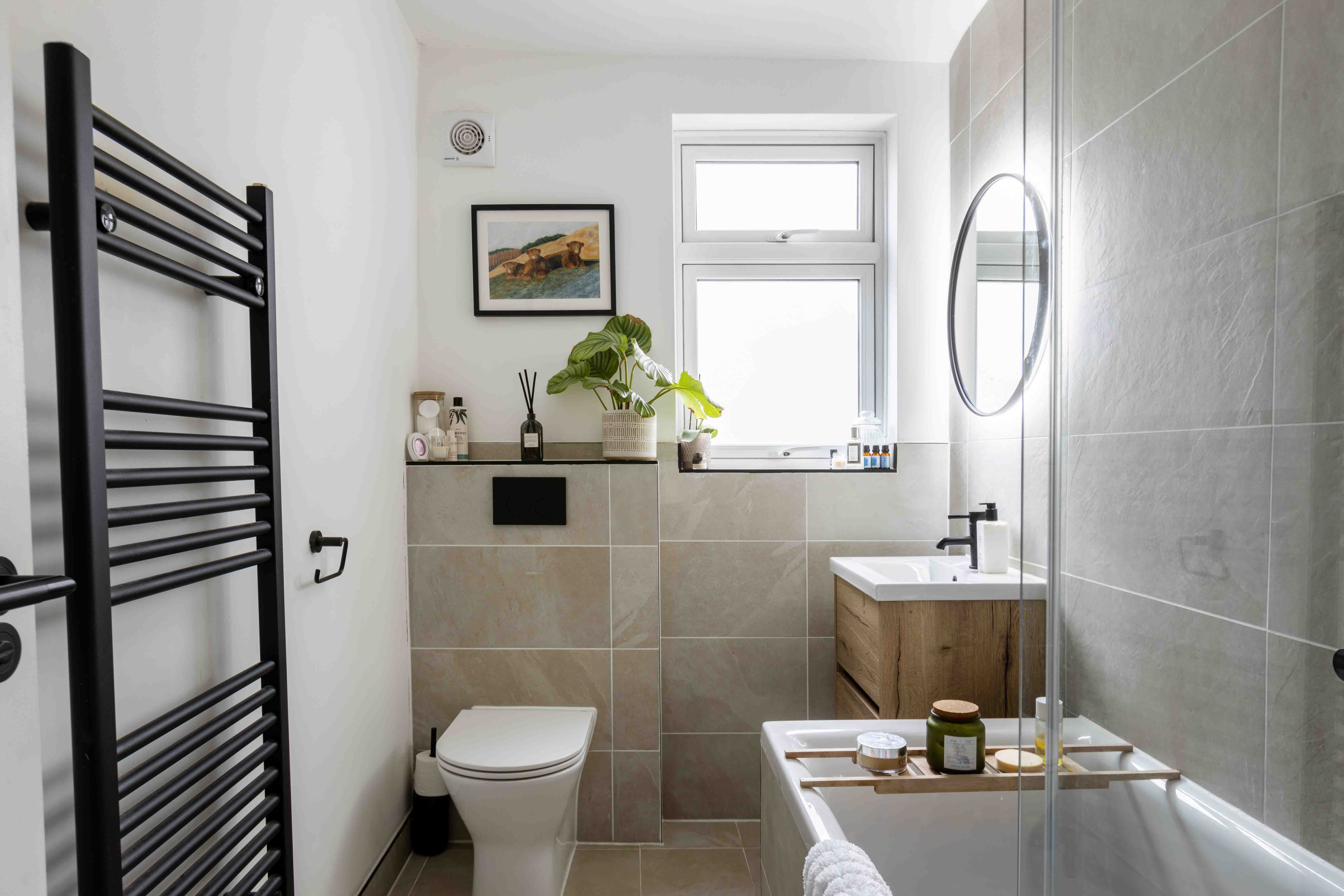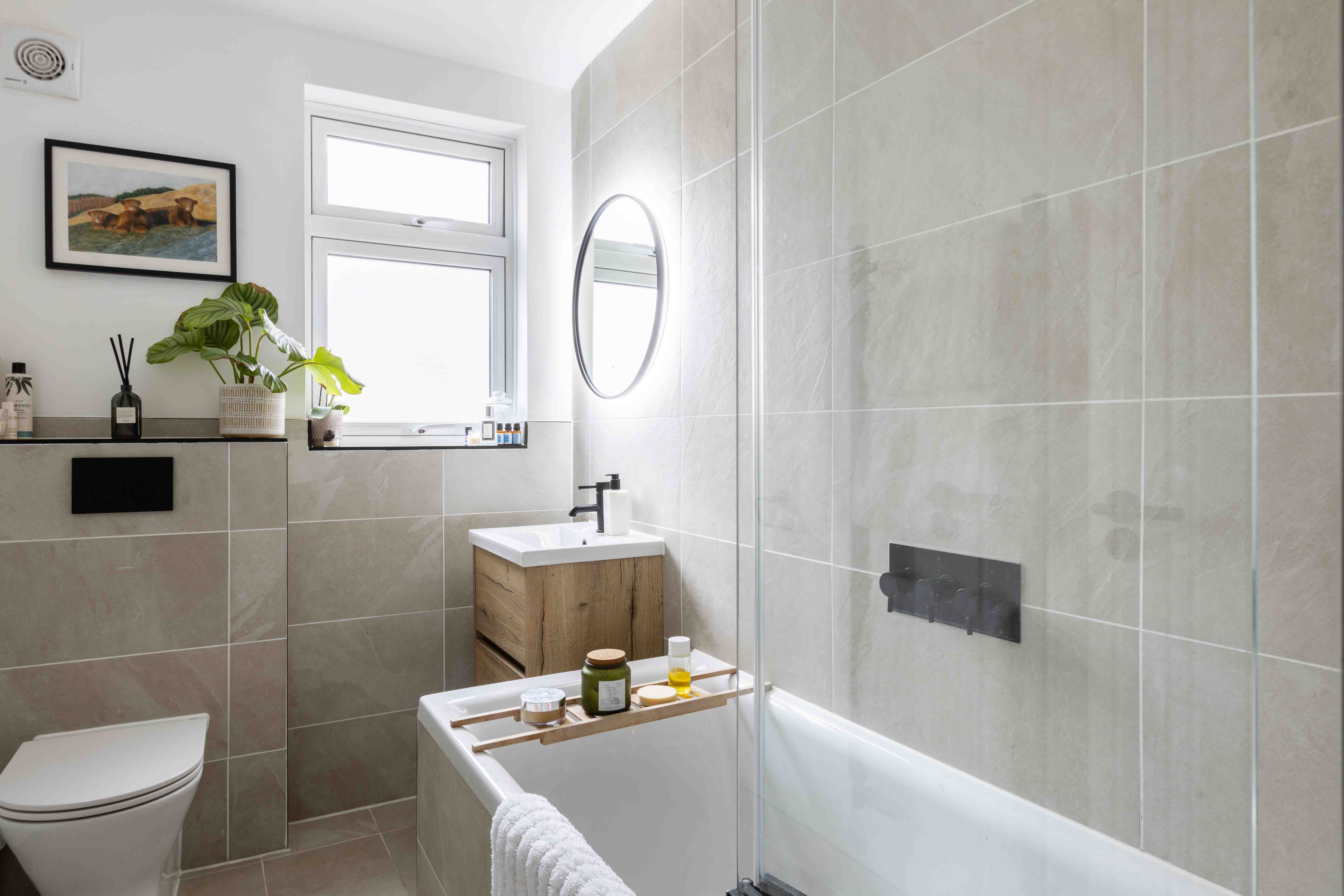 Inside, the front reception room is flooded with natural light through a large box bay window. The neutral tones, cosy burner, and classic detailing create an inviting space perfect for relaxation. The rear reception room takes on a more contemporary aesthetic, with a striking panelled feature wall, crisp white tones, and crittal-style doors opening onto a landscaped patio. The adjoining kitchen overlooks the garden and offers a practical yet stylish workspace with integrated appliances, neutral shaker cabinetry, metro tiling, and oak worktops. The west-facing landscaped garden has been thoughtfully designed with tiered levels to maximize sunlight throughout the day, making it perfect for outdoor living and enjoying breathtaking sunsets. Upstairs, the double bedroom features charming shutters and a brand-new radiator, while a second single room provides convenient storage and tranquil views of the garden. The family bathroom is beautifully designed, featuring textured stone tiling, modern black hardware, a floating oak sink, and sleek white sanitary ware.