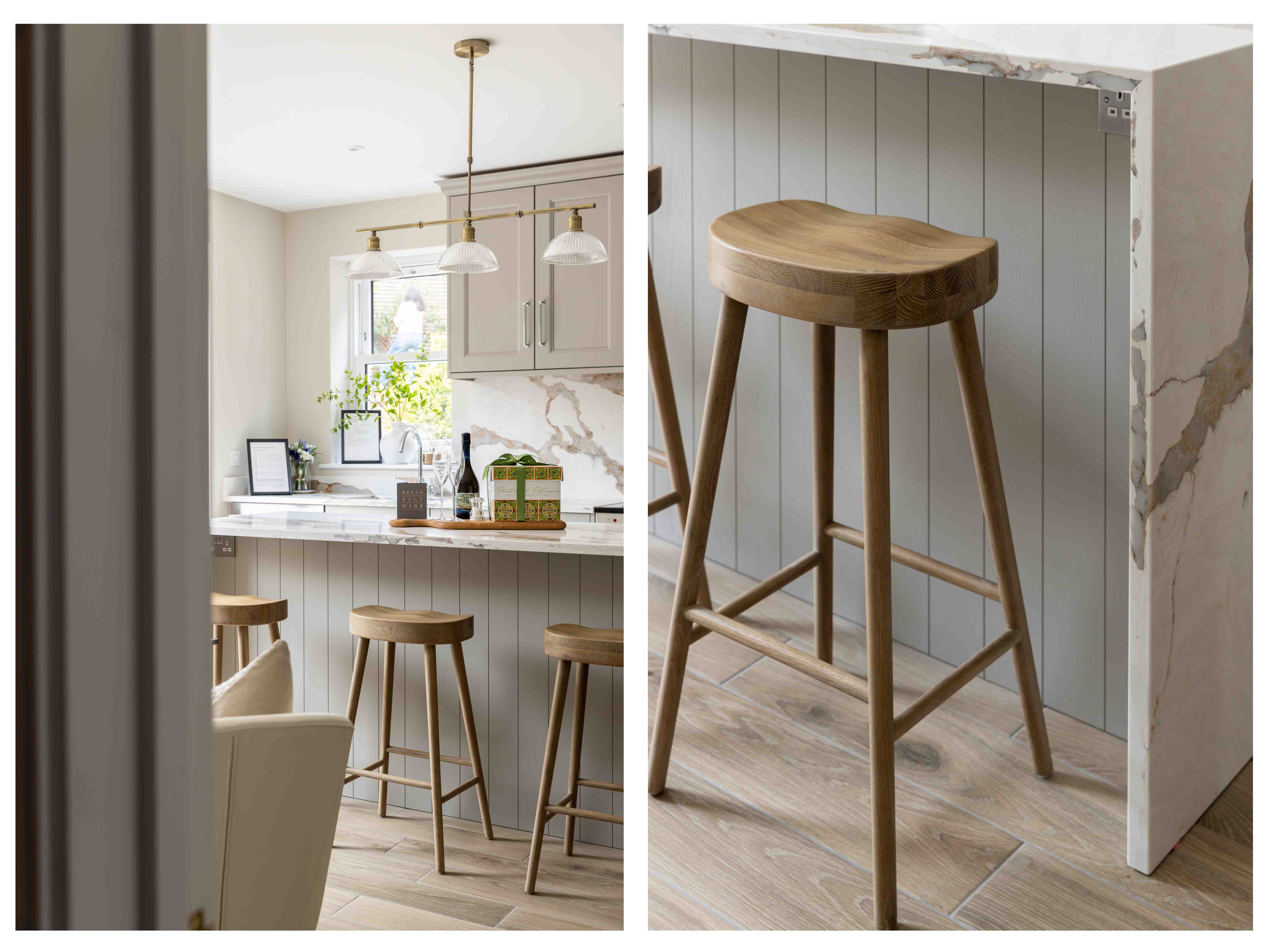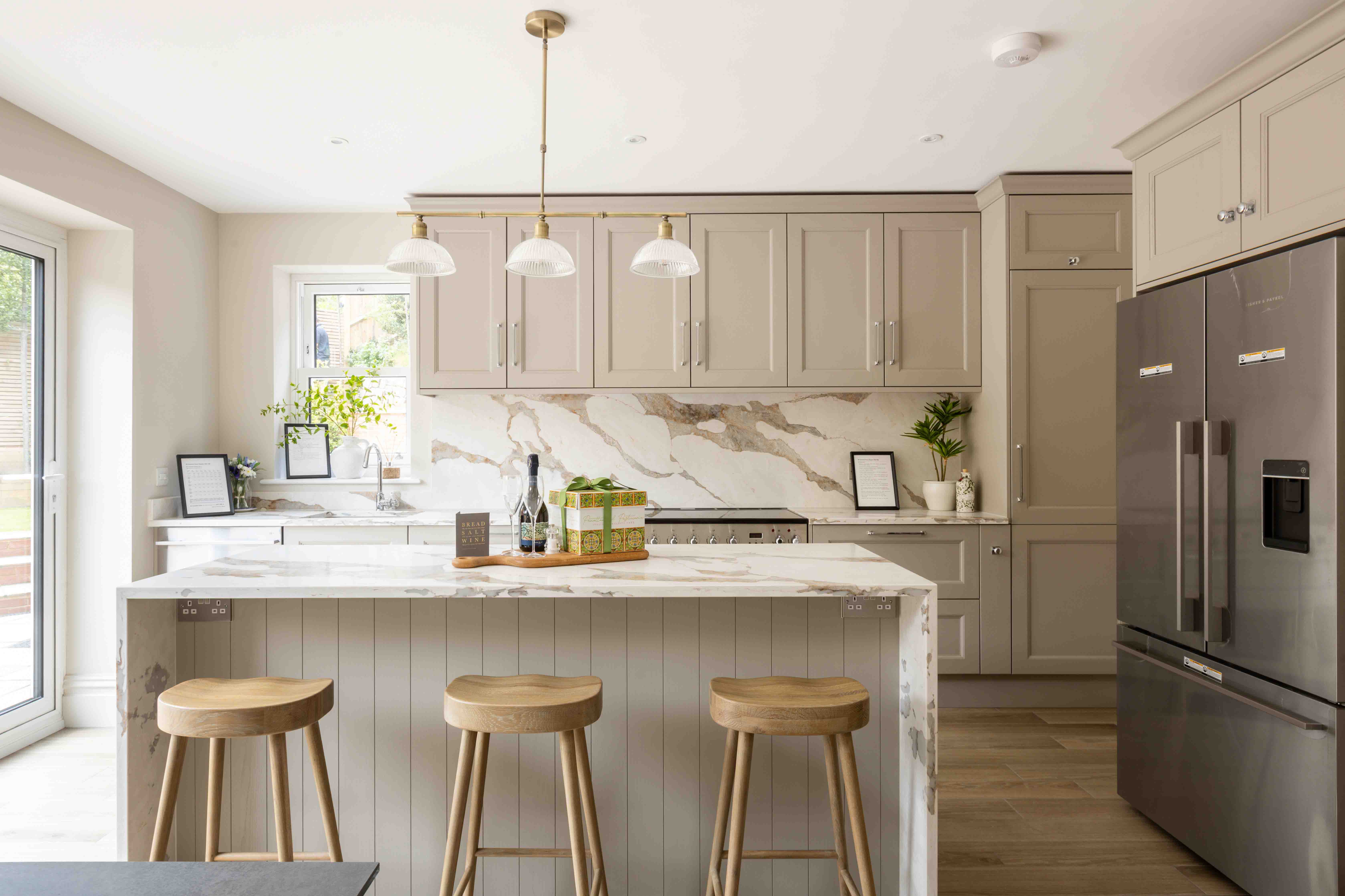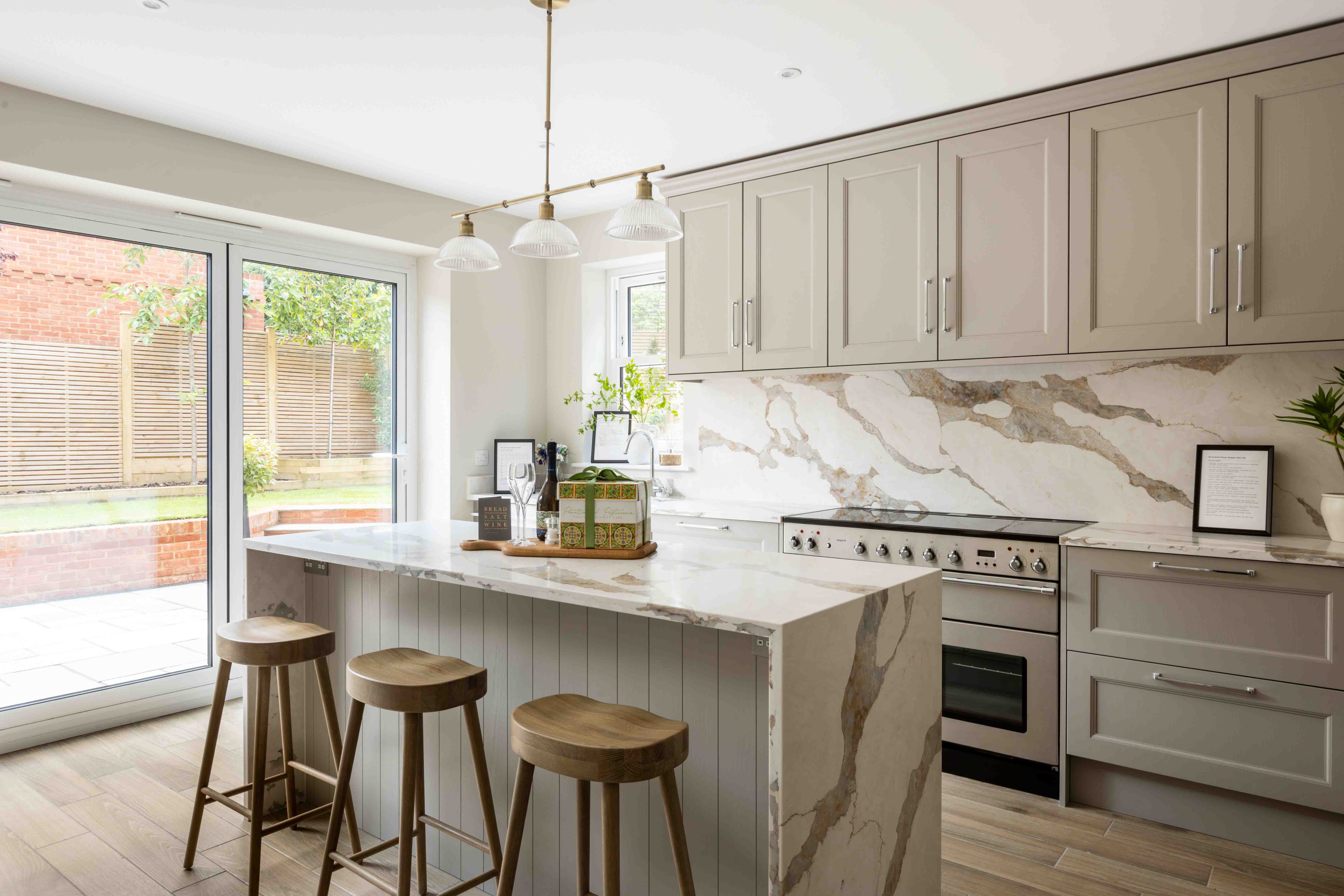 A refined elegance continues through to the statement kitchen-diner: a luxurious space with painted shaker cabinetry, quartz waterfall island, and top-tier appliances including Fisher & Paykel and Rangemaster. The kitchen’s bi-folding doors lead seamlessly to a sun-soaked south-facing garden patio, perfect for alfresco dining and summer gatherings.