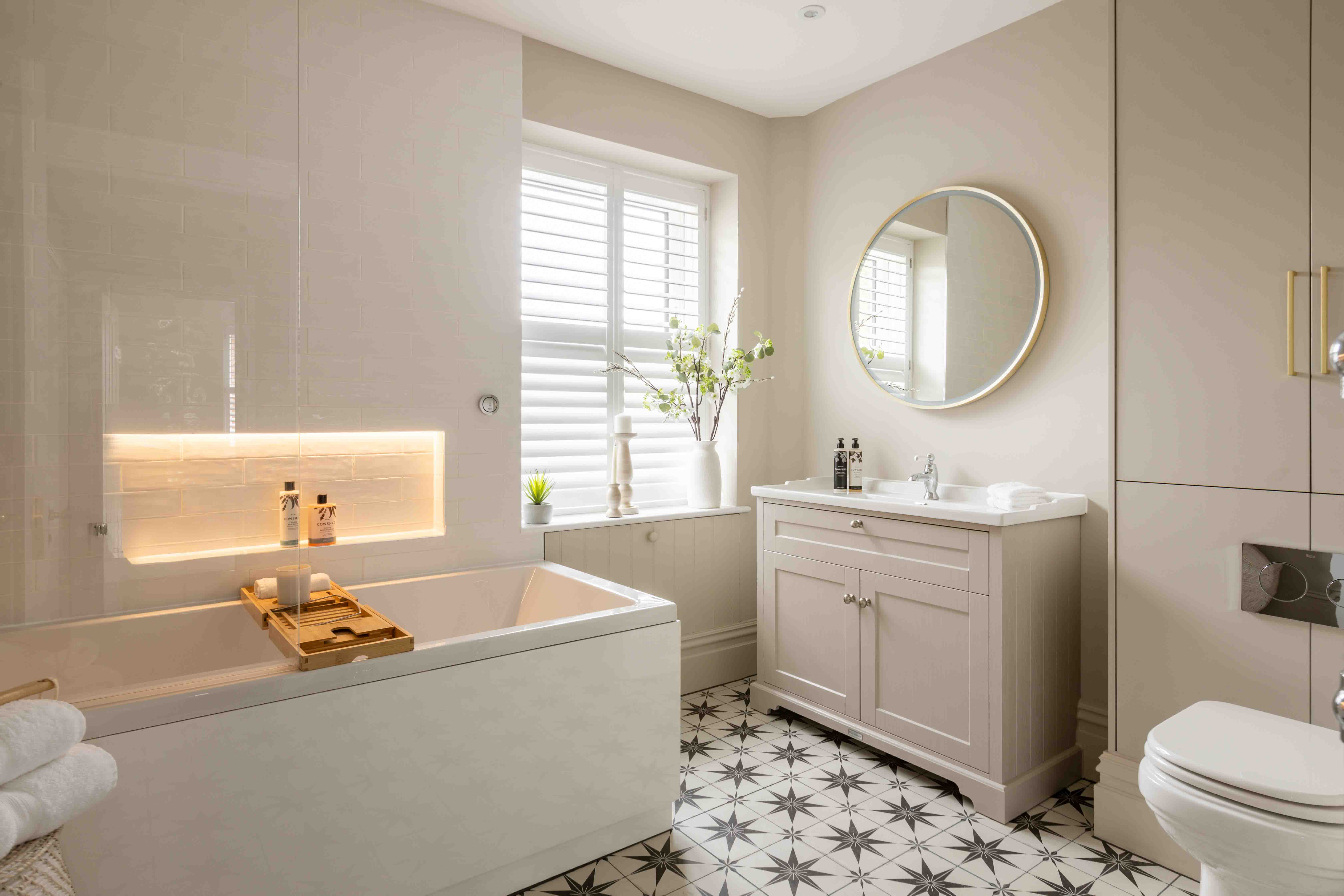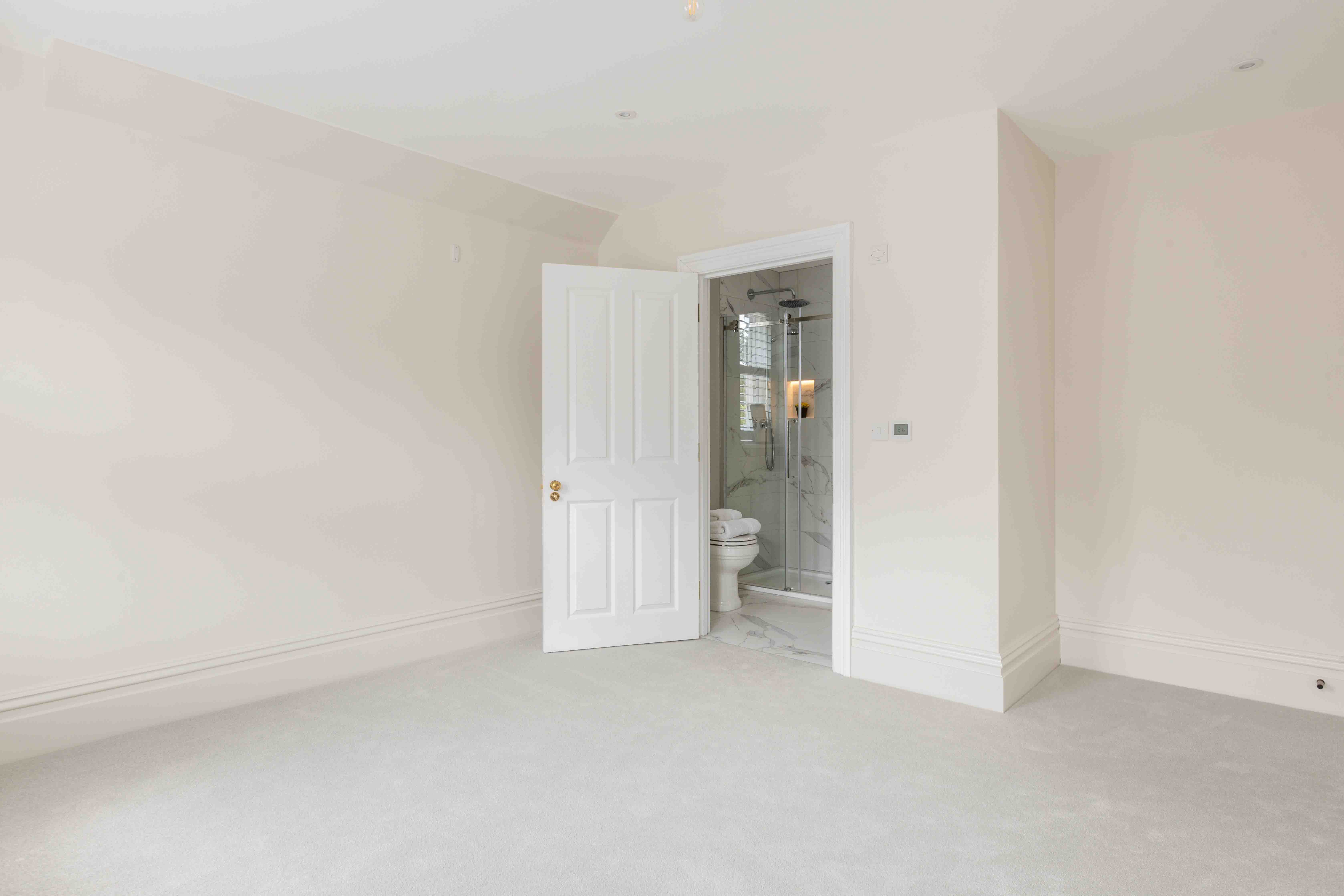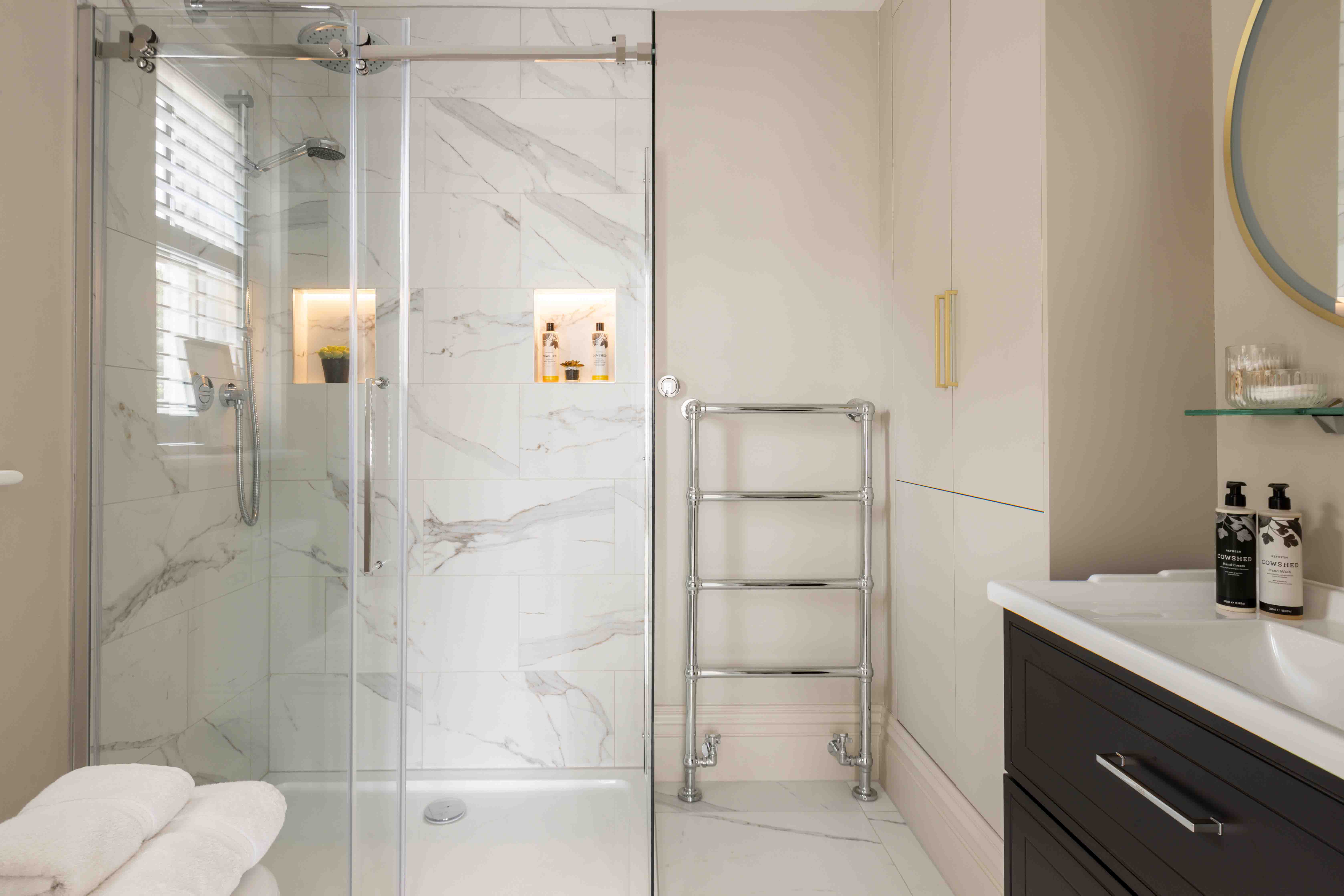 Upstairs, four generous bedrooms are arranged over two floors, including two luxurious en-suite retreats. Bathrooms are exquisitely designed with smart Aqualisa digital showers, motion-sensor lighting, and dimmable, demisting mirrors, bringing spa-like relaxation into your daily routine. Every detail, from heated towel rails to electric toothbrush nooks, has been thoughtfully included.