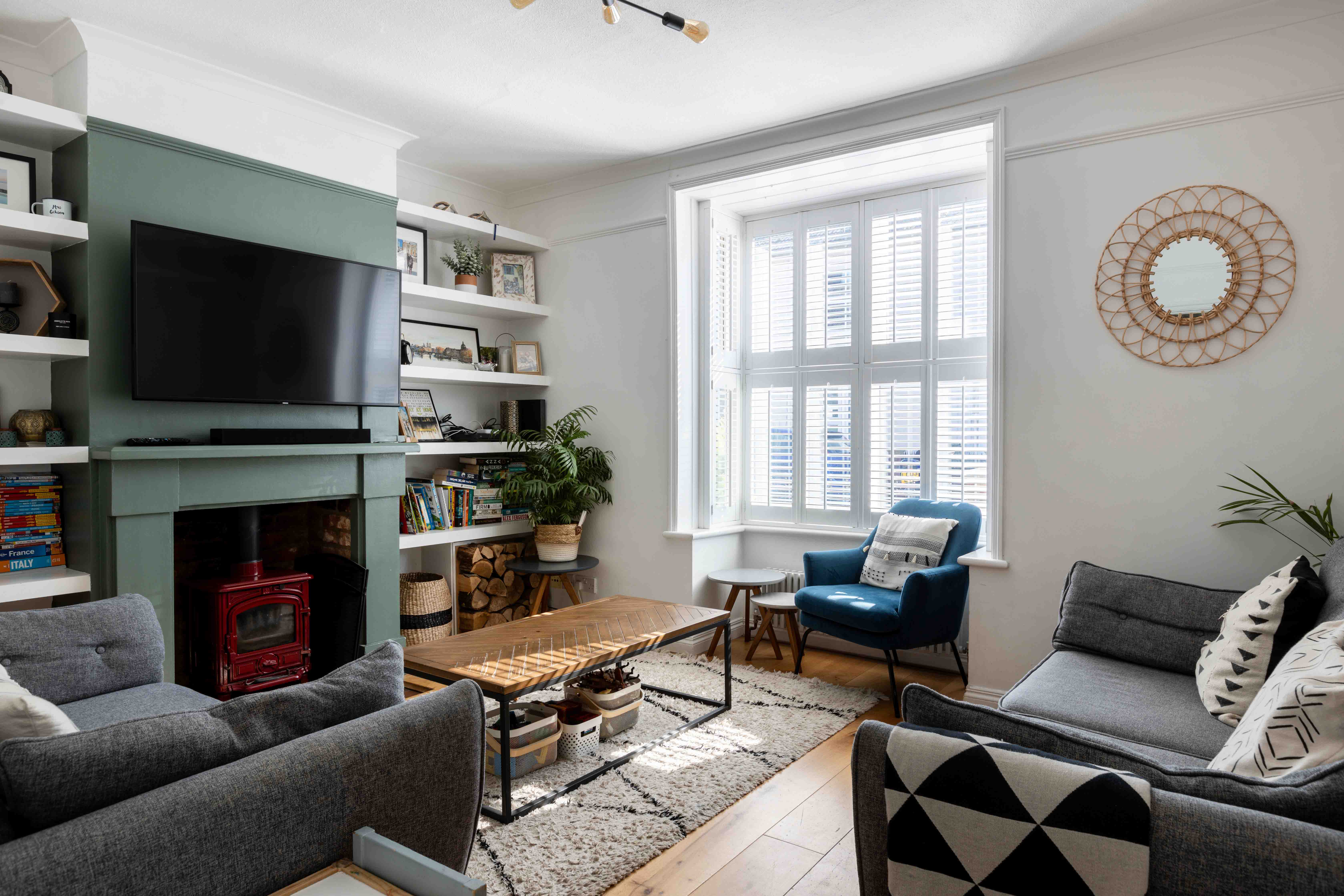 Step inside and be greeted by the front reception room, where a box bay window, custom traditional shutters, and a striking colour-blocked chimney breast with a working log burner create a cosy, welcoming space. The rear reception, currently used as a dining room, is equally inviting, and the entire ground floor benefits from threshold-free wooden flooring, adding to the sense of flow and openness. The sleek, modern kitchen is a highlight, with its crisp white slab doors, contrasting black worktop, and practical tiled flooring. There's also space for a breakfast table, making it the perfect spot for casual dining or family mornings.