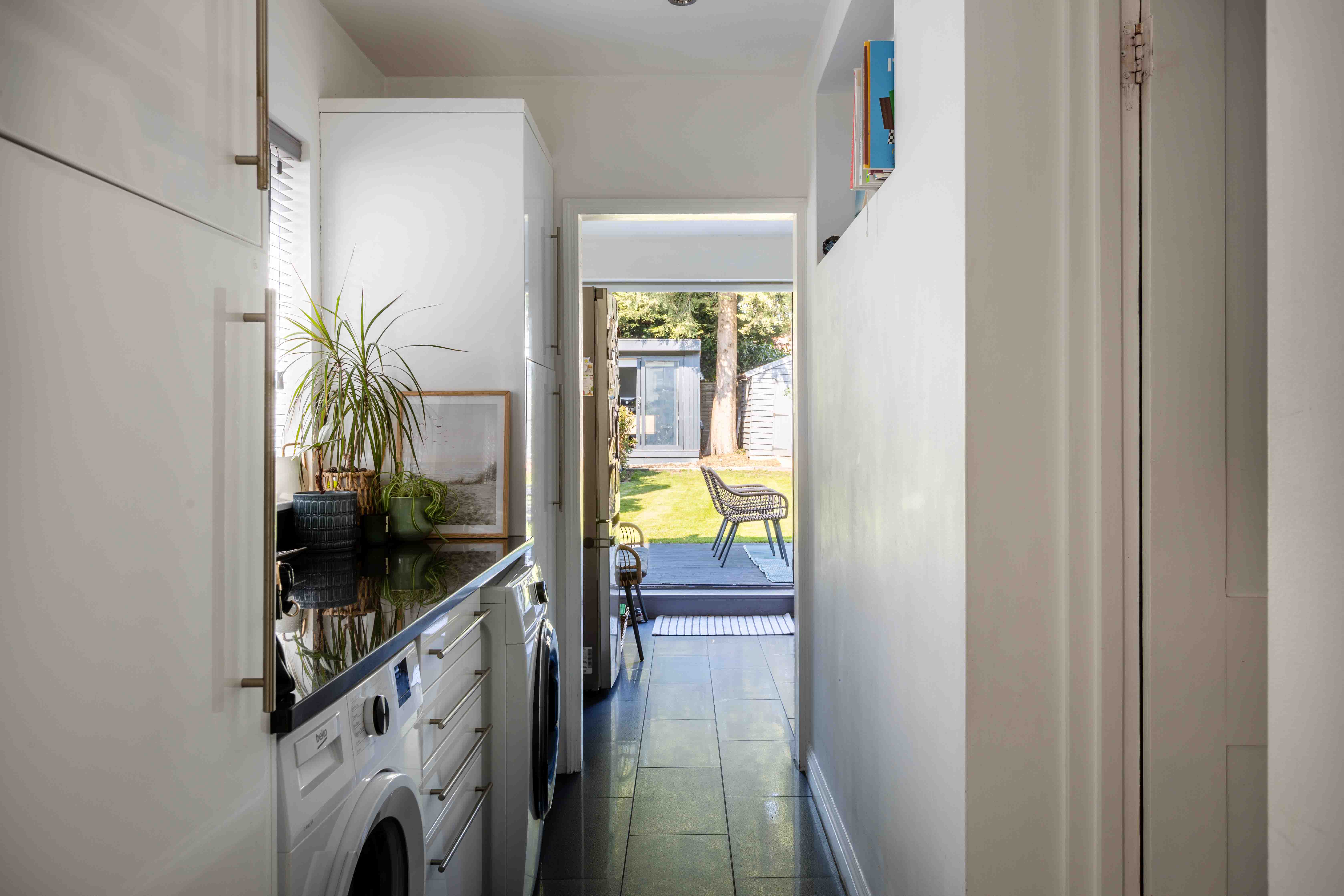 Bi-fold doors open onto the landscaped garden, seamlessly blending indoor and outdoor living. The garden itself is a peaceful retreat, with a decking area ideal for al fresco dining, a sunlit lawn, and tidy planting. At the far end of the garden, a purpose-built home office with power and lighting offers the perfect environment for remote work or creative pursuits, while a shed provides extra storage. Downstairs, the modern family bathroom boasts large stone slab tiling and contemporary white sanitary ware. A utility room with ample storage adds to the home's practicality, and upstairs, you'll find two generously sized double bedrooms and a good-sized single bedroom, all neutrally decorated for a fresh, airy feel. The principal bedroom also benefits from an en suite cloakroom, adding a touch of luxury to this already delightful home.