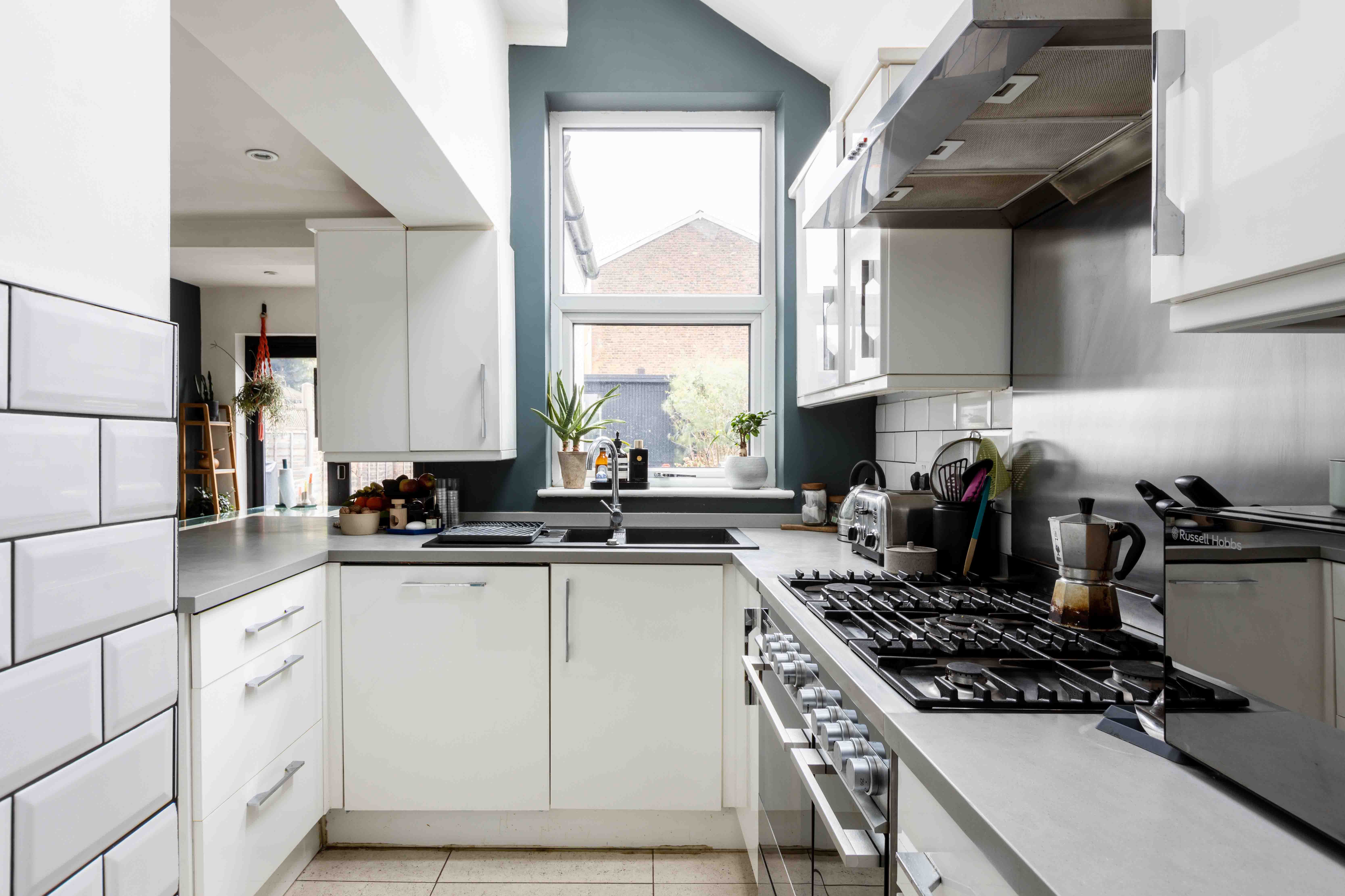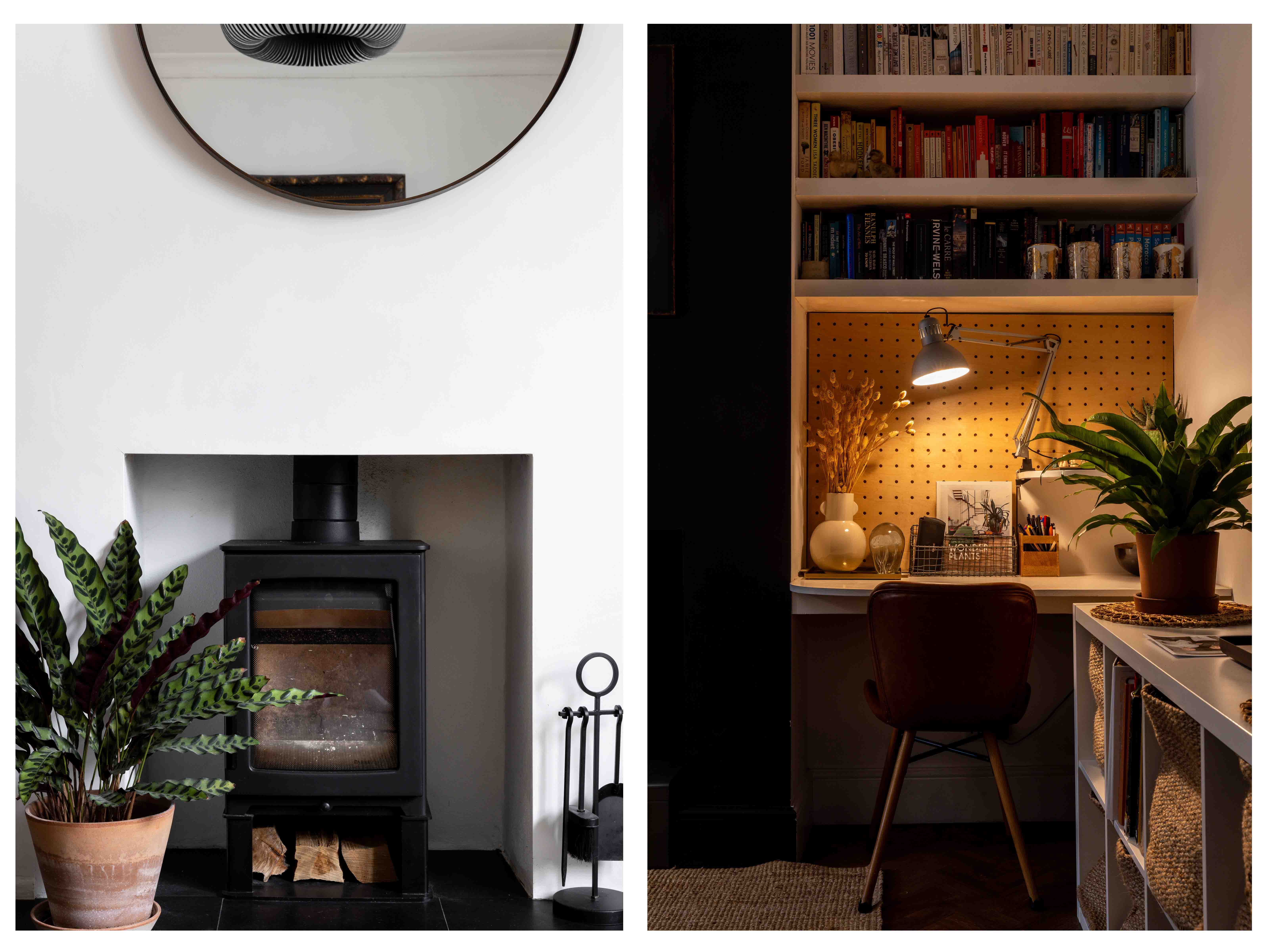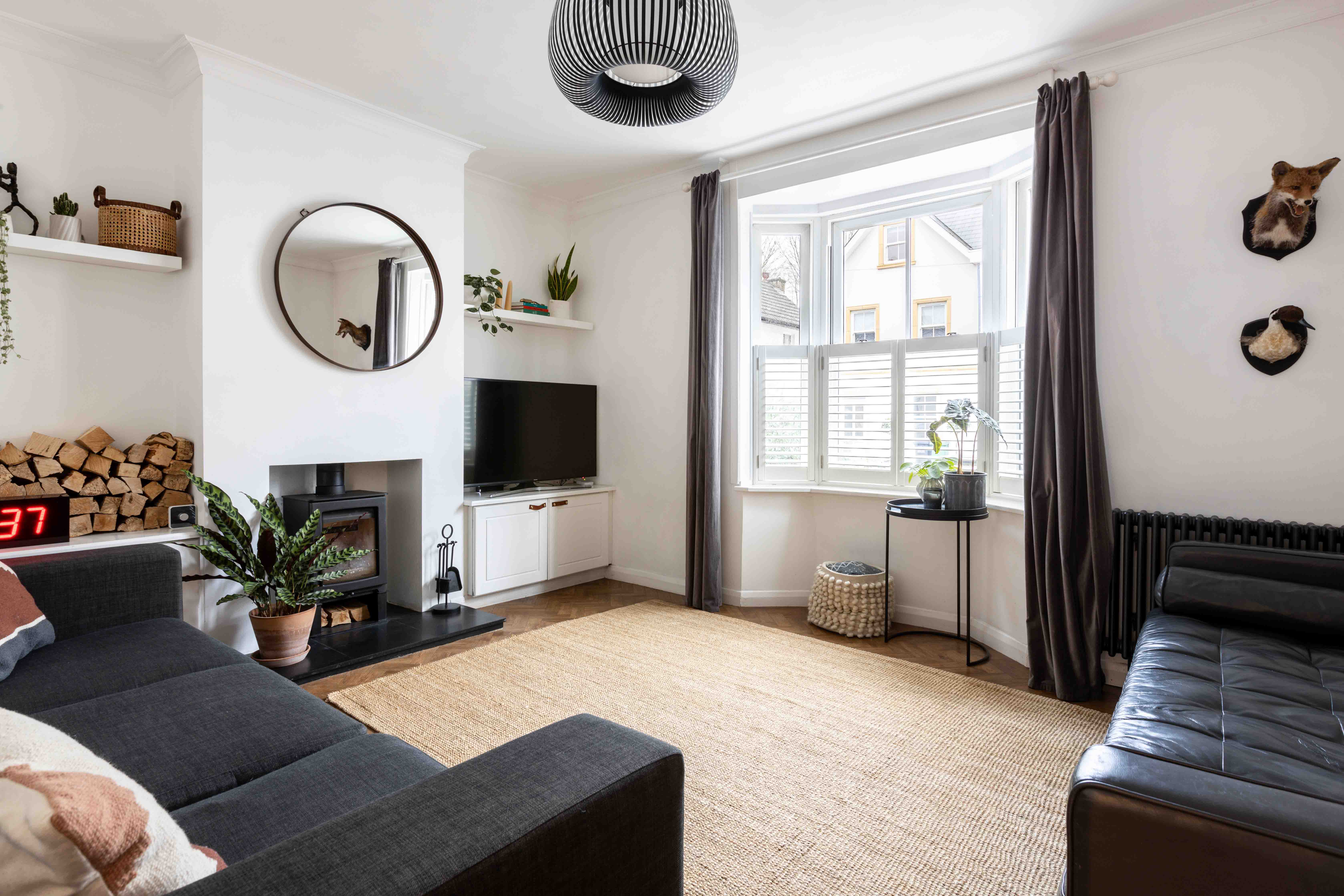 A walled front garden with pretty planting is striking against the traditional red brick exterior, with a tiled pathway guiding you to the front door. Step inside and be greeted by the front reception room, where a box bay window, custom traditional shutters, and a striking colour-blocked chimney breast with a working log burner create a cosy, welcoming space. The rear reception, currently used as a dining room, is equally inviting, and the entire ground floor benefits from threshold-free wooden flooring, adding to the sense of flow and openness. The sleek, modern kitchen is a highlight, with its crisp white slab doors, contrasting black worktop, and practical tiled flooring. There's also space for a breakfast table, making it the perfect spot for casual dining or family mornings.