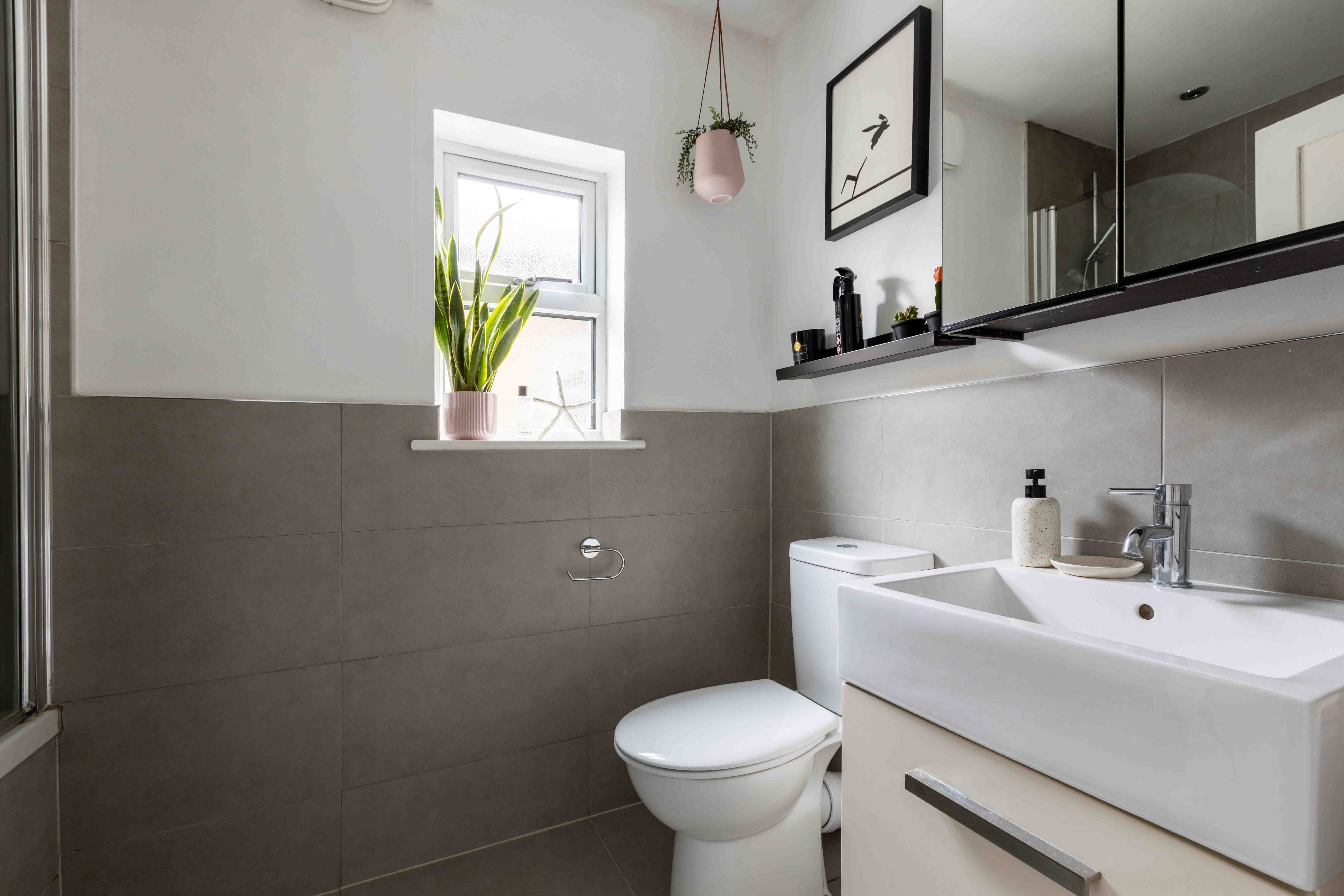 Bi-fold doors open onto the landscaped garden, seamlessly blending indoor and outdoor living. The garden itself is a peaceful retreat, with a decking area ideal for al fresco dining, a sunlit lawn, and tidy planting. At the far end of the garden, a purpose-built home office with power and lighting offers the perfect environment for remote work or creative pursuits, while a shed provides extra storage. Downstairs, the modern family bathroom boasts large stone slab tiling and contemporary white sanitary ware. A utility room with ample storage adds to the home's practicality, and upstairs, you'll find two generously sized double bedrooms and a good-sized single bedroom, all neutrally decorated for a fresh, airy feel. The principal bedroom also benefits from an en suite cloakroom, adding a touch of luxury to this already delightful home.