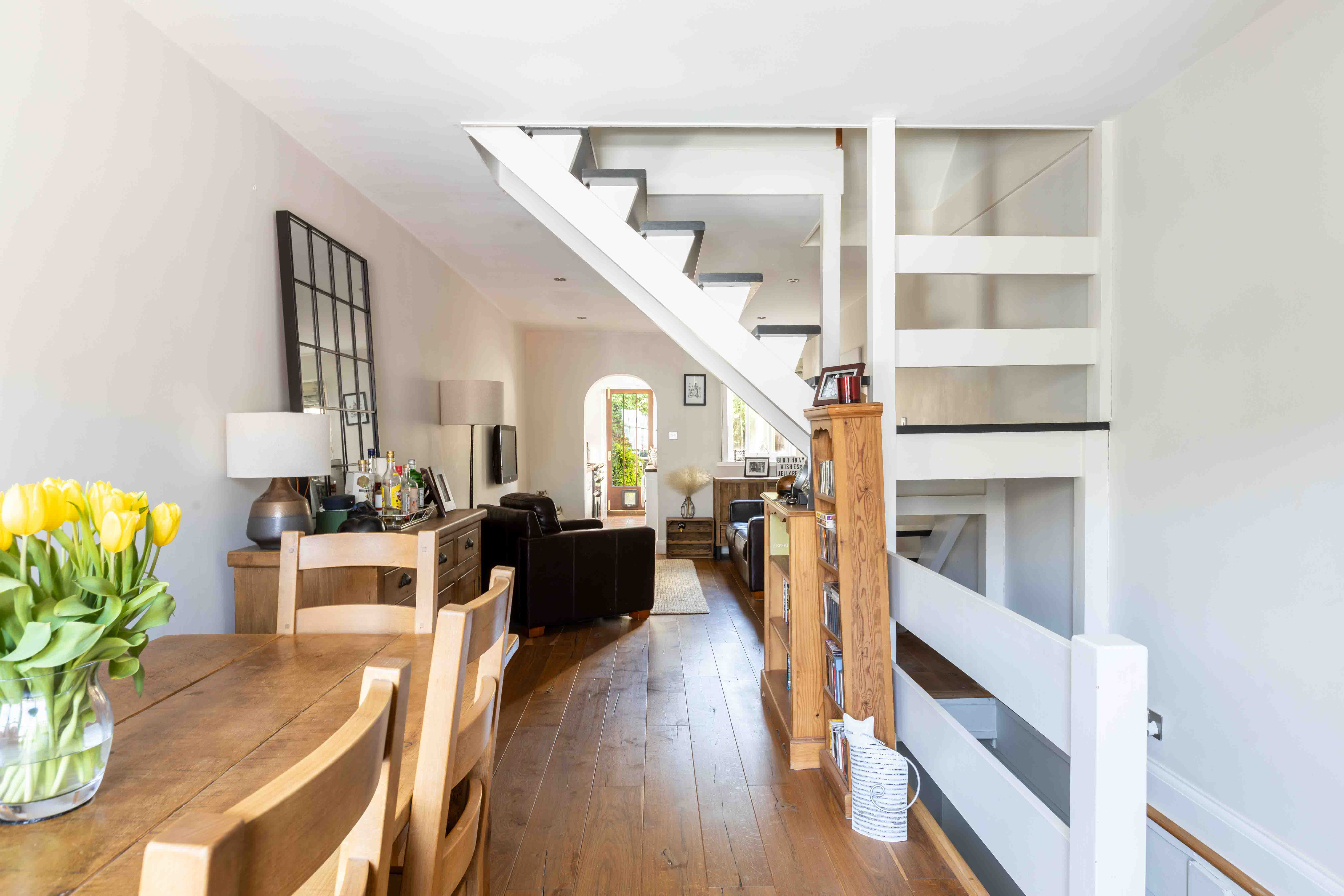 As you cross the threshold, you're greeted by a spacious open plan reception, thoughtfully divided into distinct zones. To the front, an inviting dining area beckons, while to the rear, a cosy living space awaits, separated by a staircase that stands as a centrepiece, elegantly dividing the room. Descend the stairs to discover a second expansive reception room on the lower ground floor, where natural light streams in through the window, creating an inviting ambiance. Back on the ground floor, the kitchen awaits, bathed in sunlight that dances off the white shaker cabinetry and wooden countertops, perfectly complementing the space. From here, access the garden—a verdant oasis brimming with mature plantings and tranquility. Step into the bricked courtyard, sheltered by a lush pergola, an idyllic setting for al fresco dining or quiet contemplation in the shade. Ascend the steps to the lush lawn area, basking in the warmth of a south-facing sun trap, where an office room offers a serene space for remote work, tucked away from the main living areas. Retreat to the second floor, where two double bedrooms await, each adorned with tasteful décor and offering picturesque views over the character-filled Lesbourne Village.