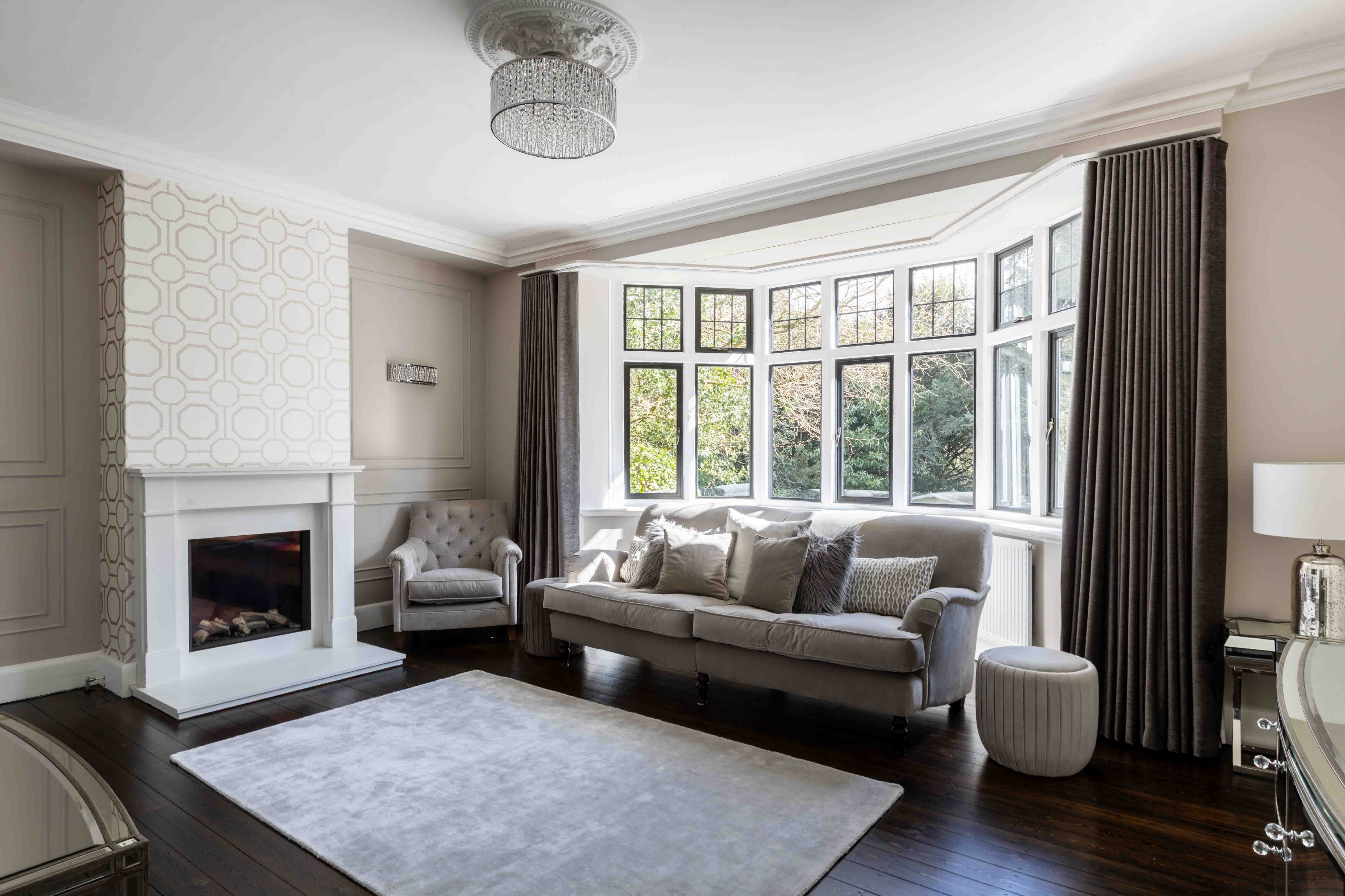 The reception rooms are each a testament to the home’s grandeur. The formal living room is a space of classic refinement, featuring a contemporary modern fireplace and a large bay window that frames breathtaking garden views.