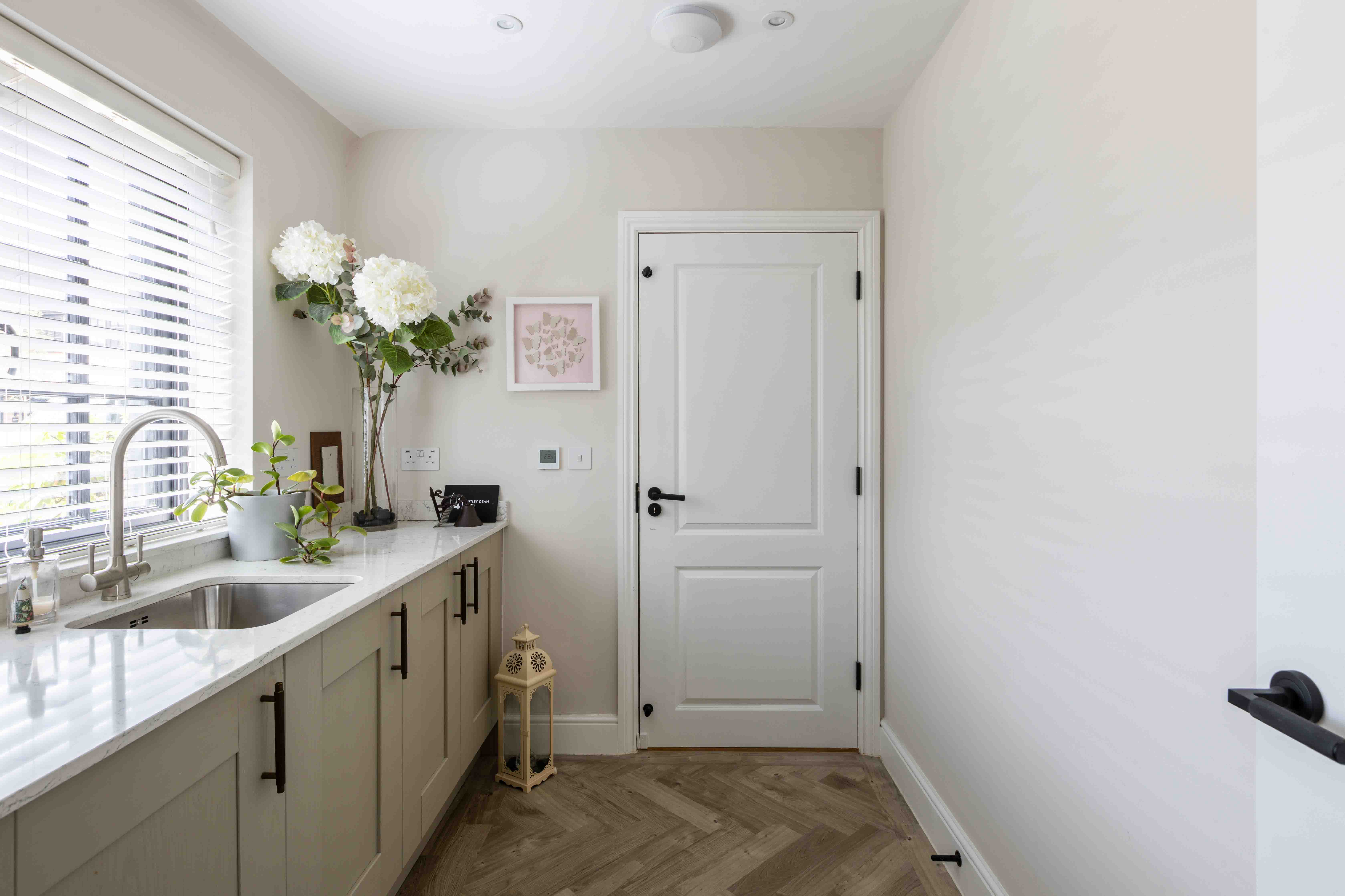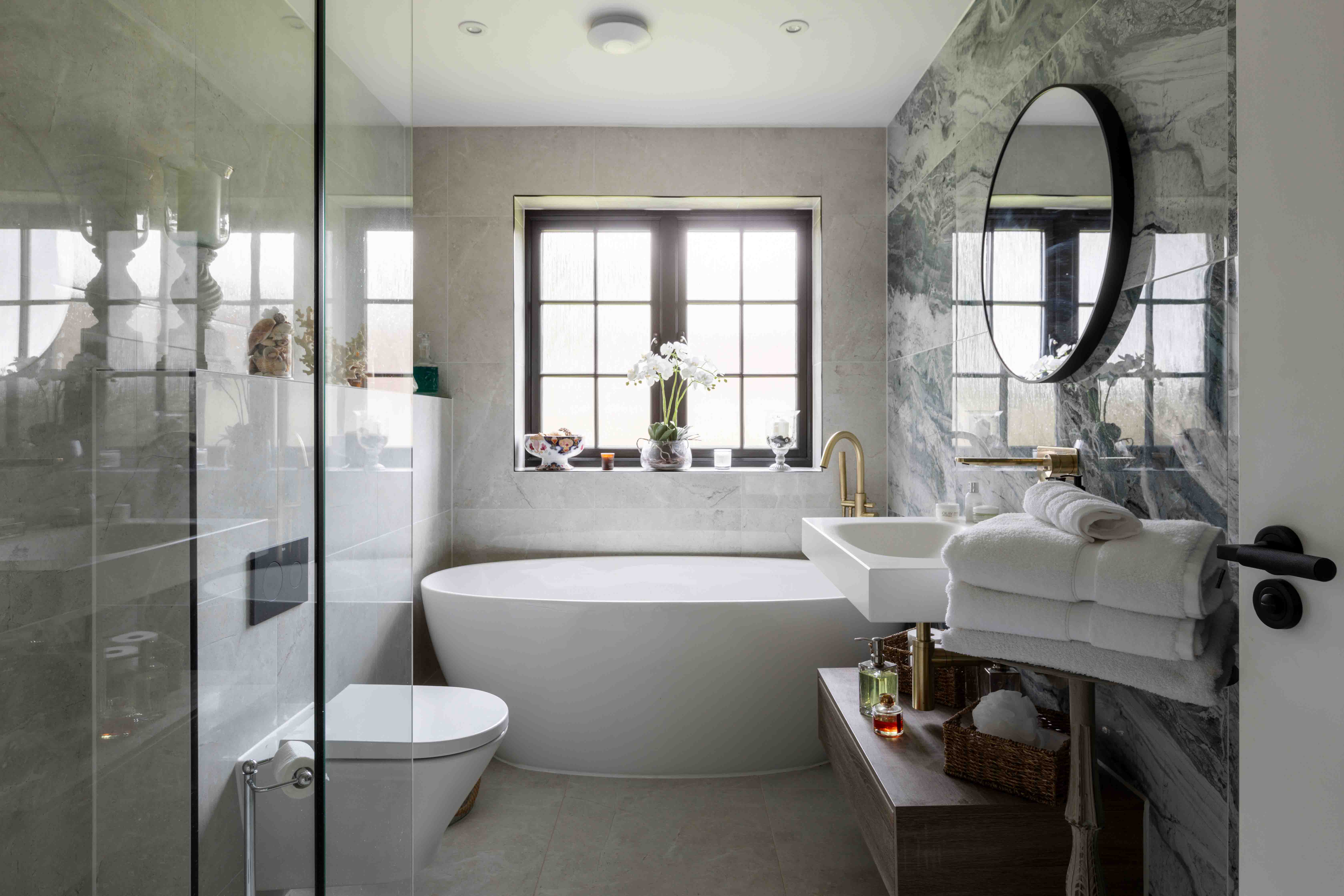 The first floor offers a flexible space that can serve as a single bedroom or a home office, complete with an en-suite shower room, making it ideal for remote working or accommodating visitors. The property boasts three uniquely designed bathrooms, each offering a distinct aesthetic. The family bathroom is a true showstopper, with marble-effect Boyden tiles, brushed gold hardware, a standalone bath, and a large walk-in shower, providing a spa-like retreat within your own home.