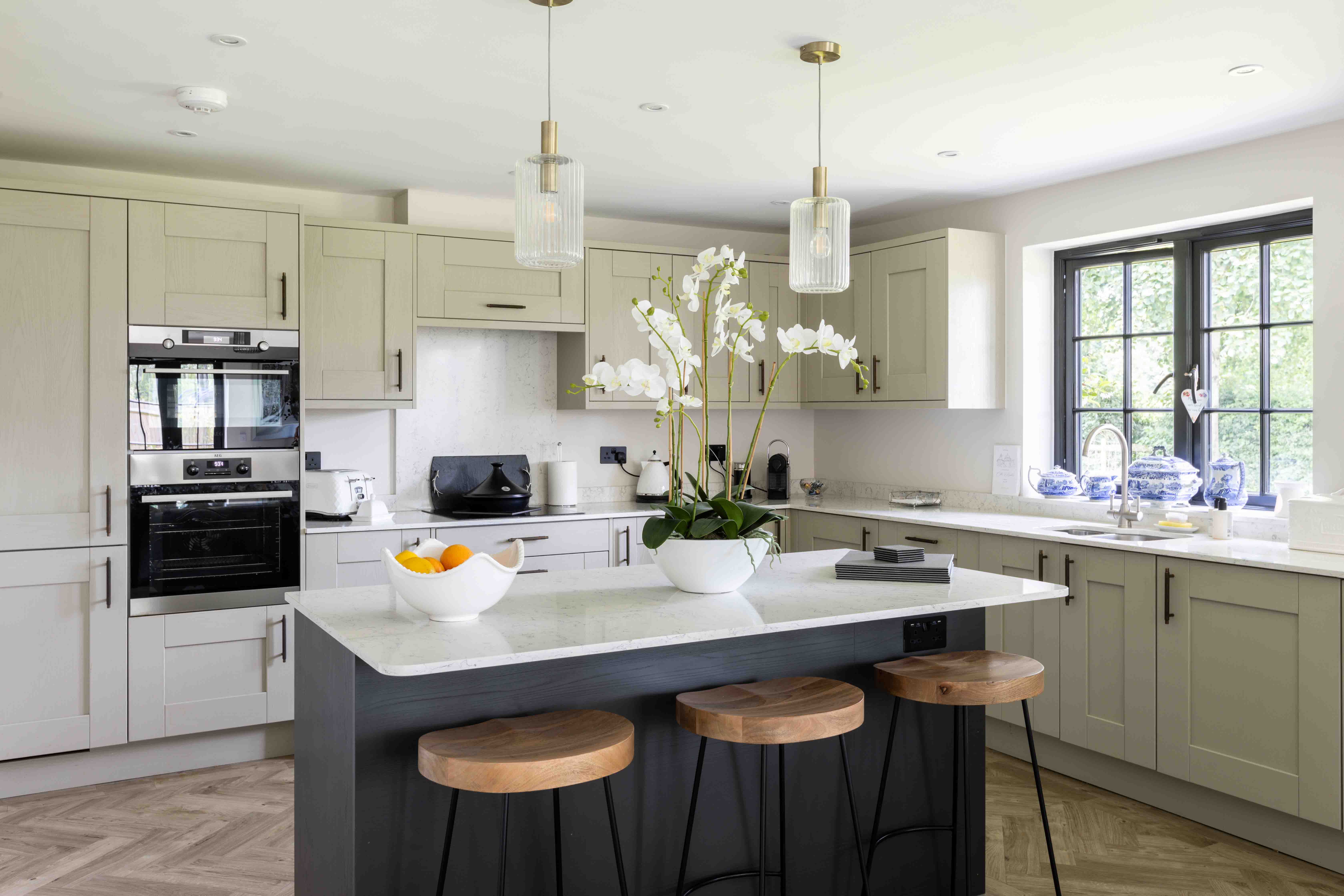 Stepping inside, the expansive open-plan kitchen and living area spans the length of the property, providing a versatile space for both relaxation and entertainment. Featuring classic shaker-style cabinetry in two tones and a stone worktop, the kitchen combines elegance with functionality. A central island with a breakfast bar creates a natural focal point, ideal for casual meals and social gatherings.